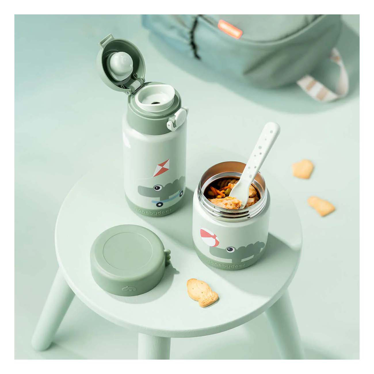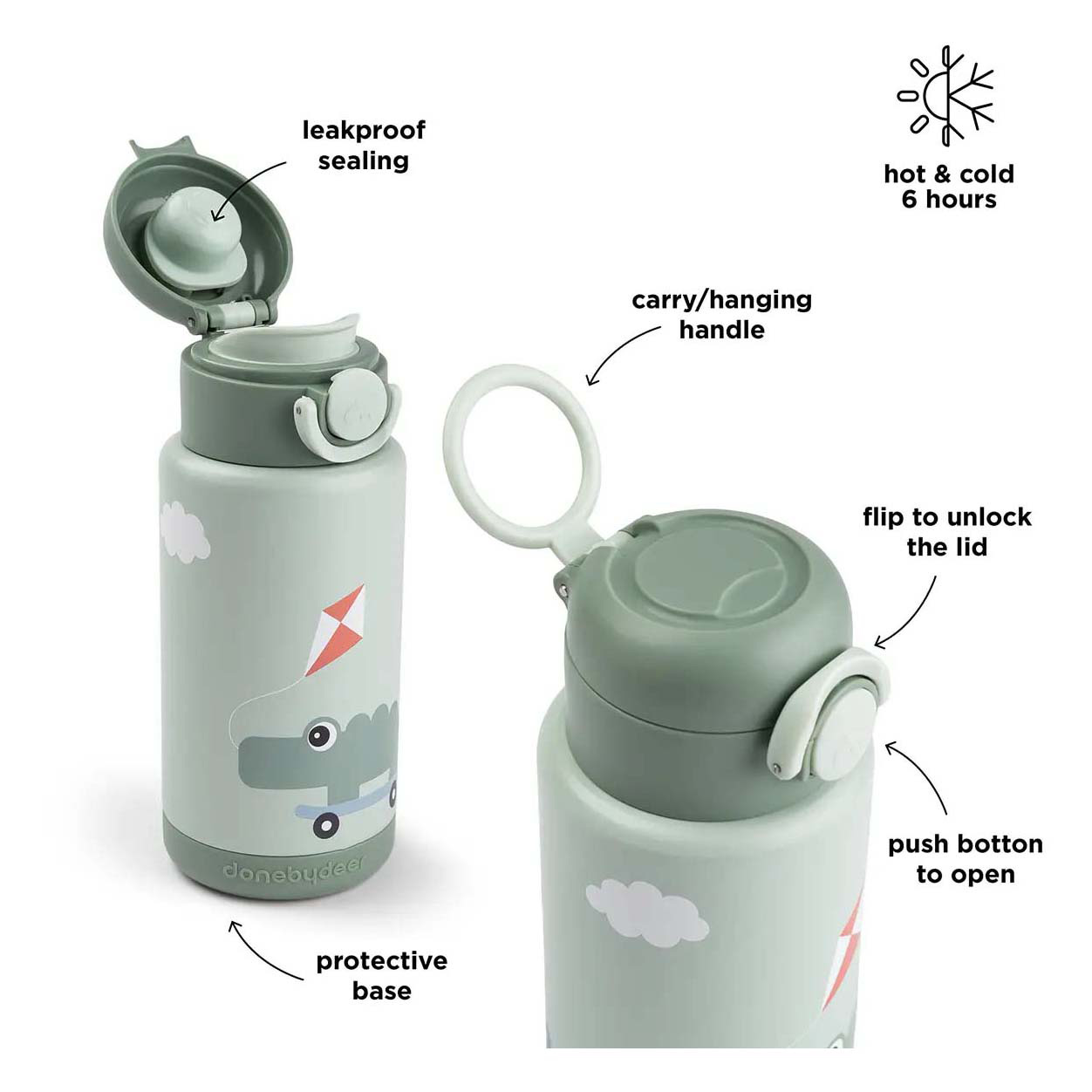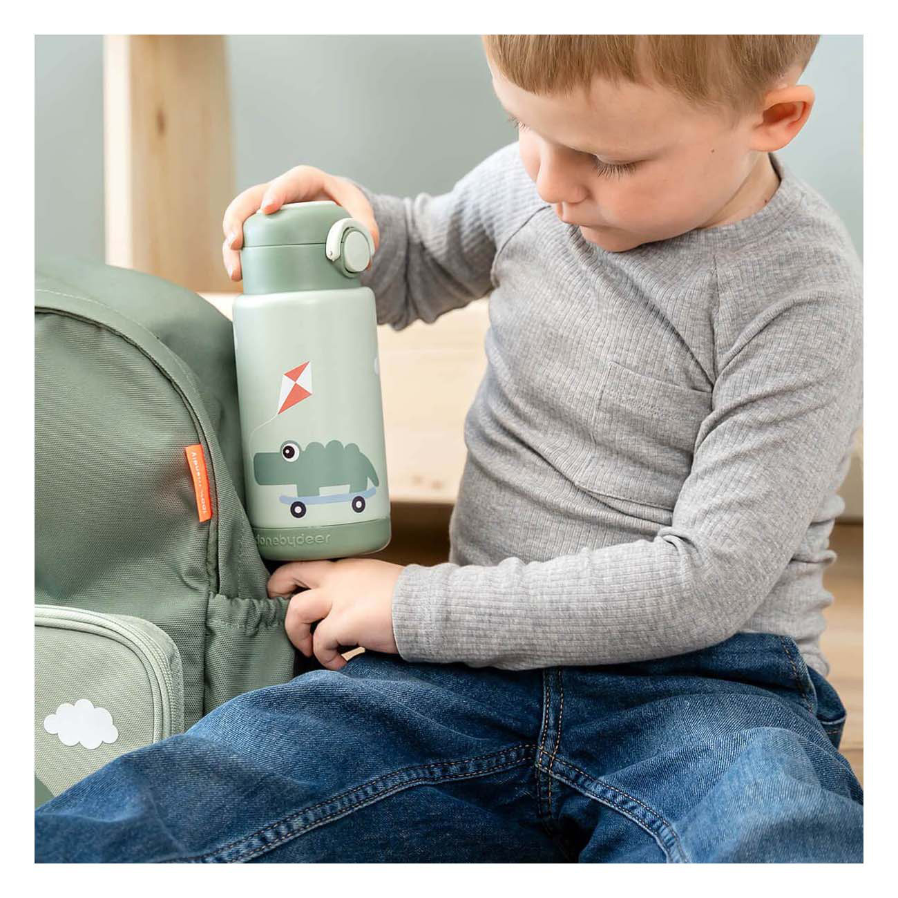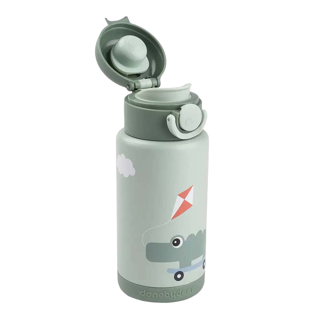 This insulated stainless steel bottle is built to withstand daily drops, messy moments, and all the adventures your little one can embark on. Thoughtful details make it easy for little ones to drink independently: a push-button lid designed for tiny fingers, a secure silicone seal to prevent spills in backpacks, and a convenient carry handle for on-the-go use. It keeps drinks just the way your little one likes them—hot or cold—for up to six hours on the go. With a 340ml capacity, it's the perfect size to stay fresh from morning snack to afternoon play. This light green bottle features a playful Croco and Birdee print—the perfect companions for sips on the go. Features • Easy to open for little ones with the push of a button • A silicone seal makes the bottle airtight and leak-proof • Keeps liquid warm or cool for up to 6 hours, with a gradual temperature change over time • A practical carrying handle makes it easy to carry • The bottle has a 340ml capacity • Perfect for preschoolers, school and outdoor adventures • Cool green colour with a fun Croco & Birdee motif