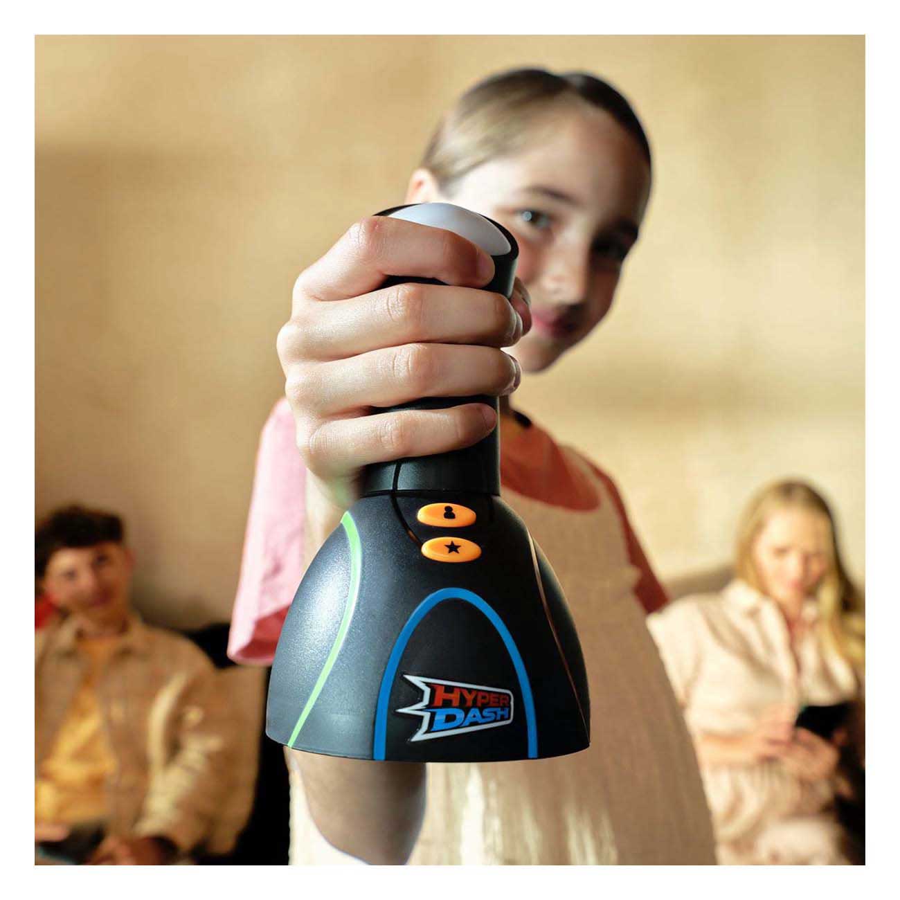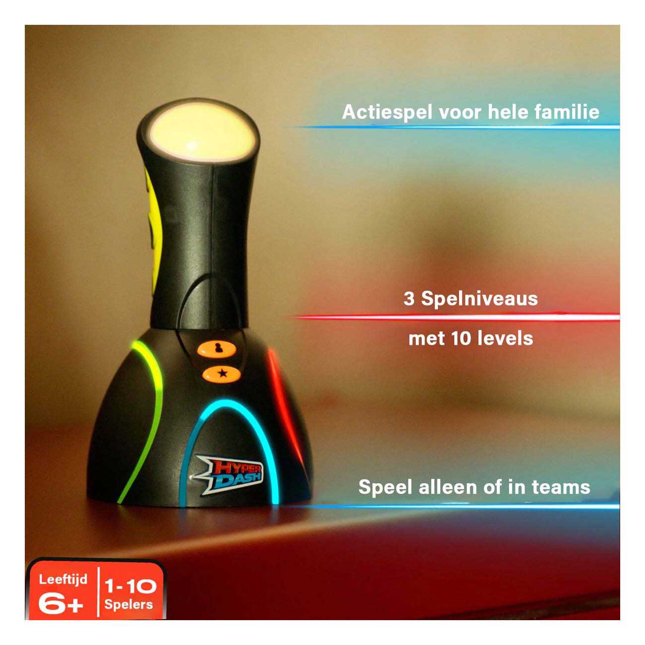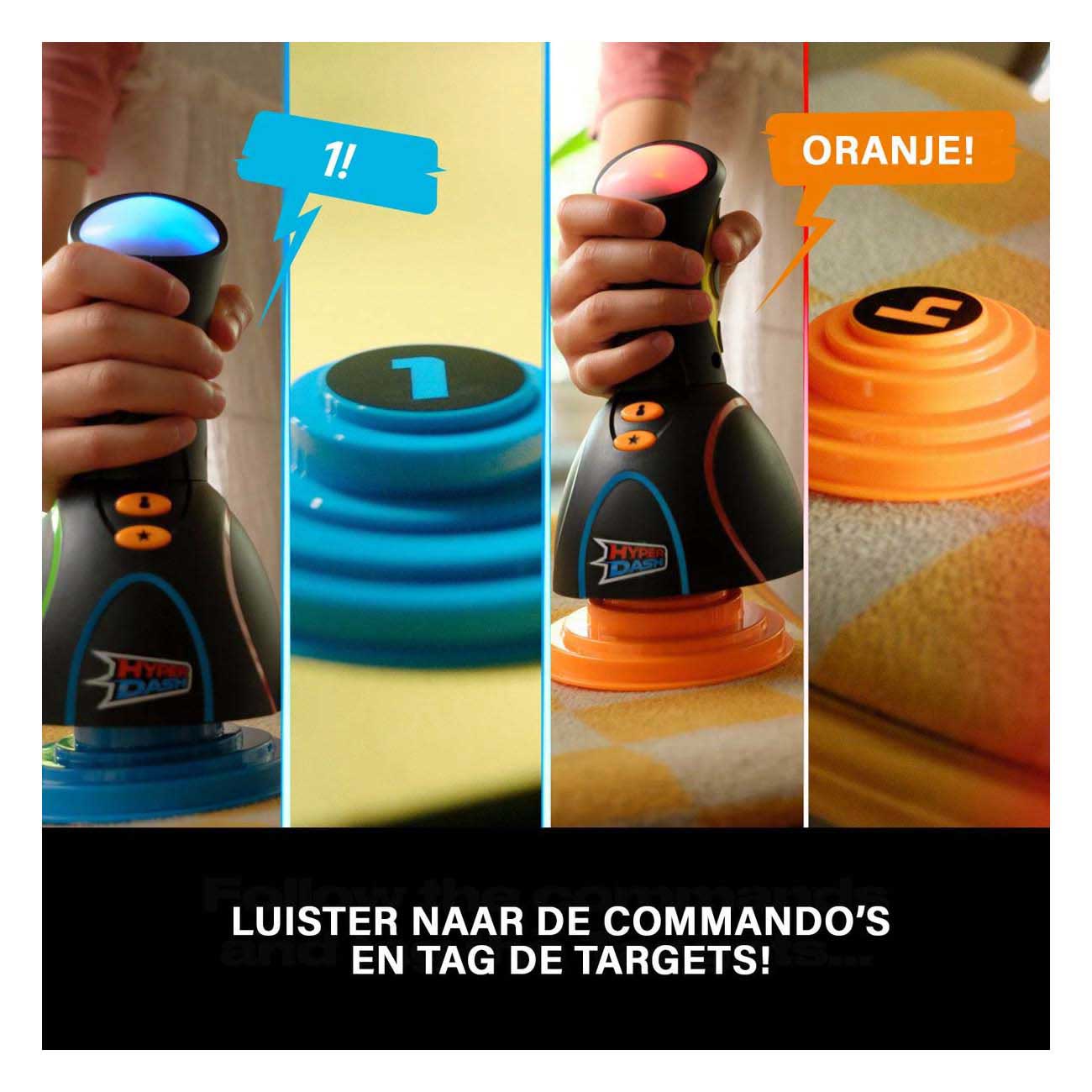 Hyper Dash is an electronic racing game that puts your reaction time to the test! The game consists of the electronic Hyper Dash Tagger and 5 colored targets with numbers on them. Create a playing field with the 5 targets. There are different game levels, from easy to challenging. In level 1, you tag only colored targets. In level 2, you combine colors and numbers. In level 3, you complete fast-paced tasks with multiple targets simultaneously! The levels become increasingly difficult. Play solo or in teams and race against the clock—choose 30, 60, or 90 seconds. Listen carefully to your Tagger and keep your eyes on the light: “Green! 5! Red! 2!”—and tag the correct targets as quickly as possible. Who reacts the fastest? Who scores the highest? Hyper Dash is action, fun, and competition for all ages! Are you ready to race? Let's Hyper Dash! Number of players: 1-10 players. Age indication: 6 years+