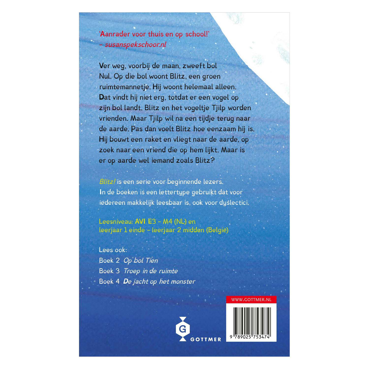 Far away, beyond the moon, floats ball Zero. On that ball lives Blitz, a green spaceman. He lives all alone. He doesn't mind, until a bird lands on his ball. Blitz and the bird Tjilp become friends. But after a while Tjilp wants to return to earth. Only then does Blitz feel how lonely he is. He builds a rocket and flies to earth, looking for a friend who looks like him. But is there anyone on earth like Blitz?