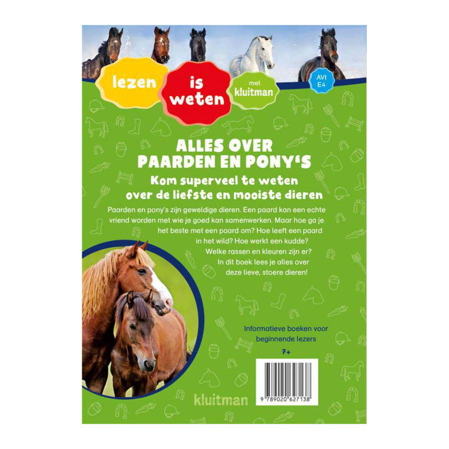Horses and ponies are wonderful animals. A horse can become a true friend with whom you can work well together. But how do you best deal with a horse? How does a horse live in the wild? How does a herd work? What breeds and colours are there? In this book you can read all about these sweet, tough animals!