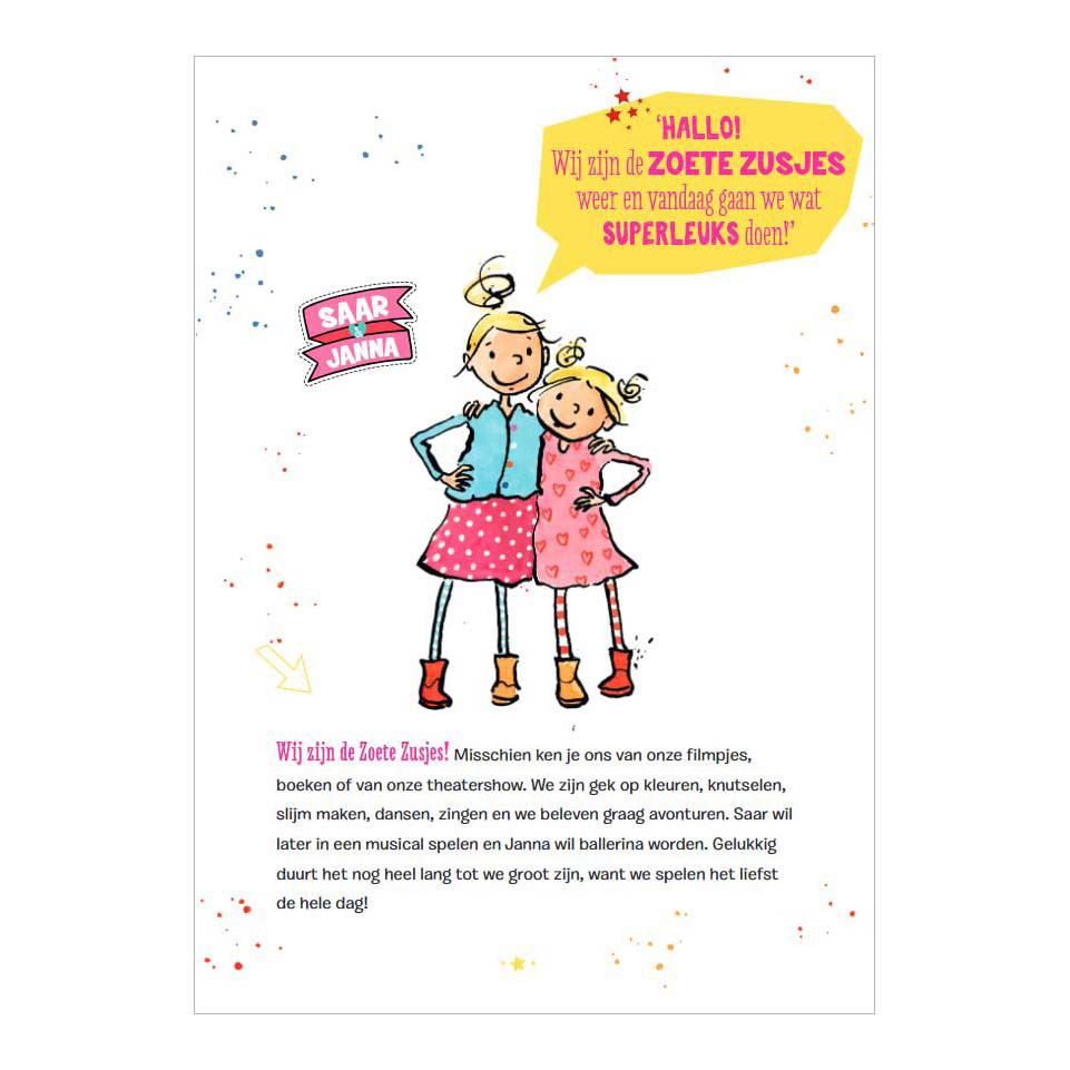 Featured on the YouTube channel De Zoete Zusjes (The Sweet Sisters). A delightful book to read aloud to children ages 4 and up, or for children ages 7 and up who want to read independently. Featuring tons of full-color illustrations by Iris Boter, glitter on the cover, and a fun search-and-find picture. This makes it the perfect gift for any child, whether for a birthday, graduation, moving house, Sinterklaas, Christmas, or just because.
