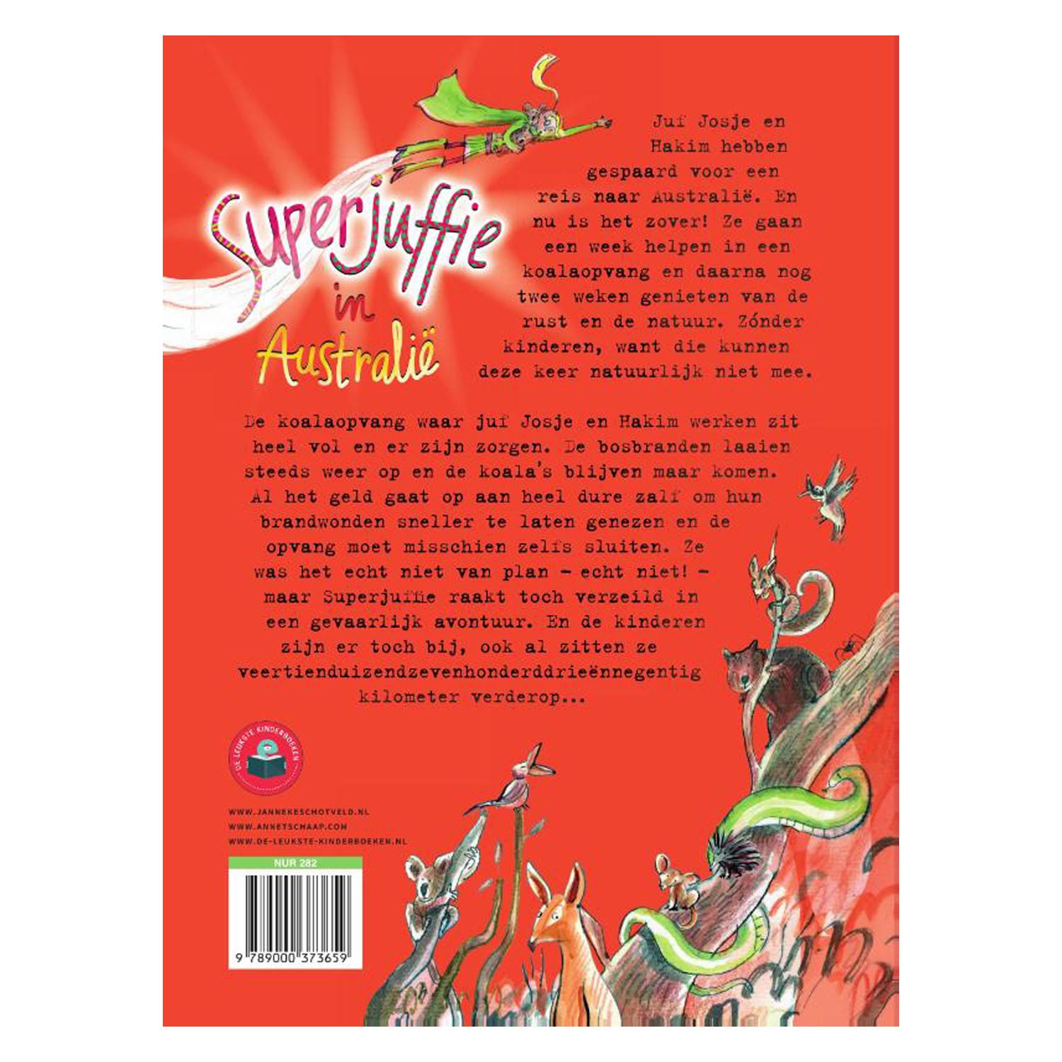 Teacher Josje and Hakim have been saving up for a trip to Australia. And now it's finally happening! They're going to help out at a koala sanctuary for a week and then enjoy the peace and quiet of nature for another two weeks. No children, because they absolutely won't be allowed to come this time. The koala sanctuary where Teacher Josje and Hakim work is overcrowded, and there are concerns. The forest fires keep flaring up, and the koalas keep coming. All the money is spent on expensive ointment to help their burns heal faster, and the sanctuary might even have to close. And even though she really didn't plan it—really not!—Superjuffie ends up in a dangerous adventure. And the children are with her, even though they're fourteen thousand seven hundred and ninety-three kilometers away... Superjuffie in Australia is the ninth installment in the popular series about the coolest teacher in the Netherlands! With funny drawings by Annet Schaap. Also read from this series: • Superjuffie! • Super Teacher takes action • Super Teacher on safari • Super Teacher in the soup • Super Teacher in the jungle • Super Teacher at camp • Super Teacher at the South Pole • Super Teacher and the monkey circus • Super Teacher in Australia • Super Teacher in the storm