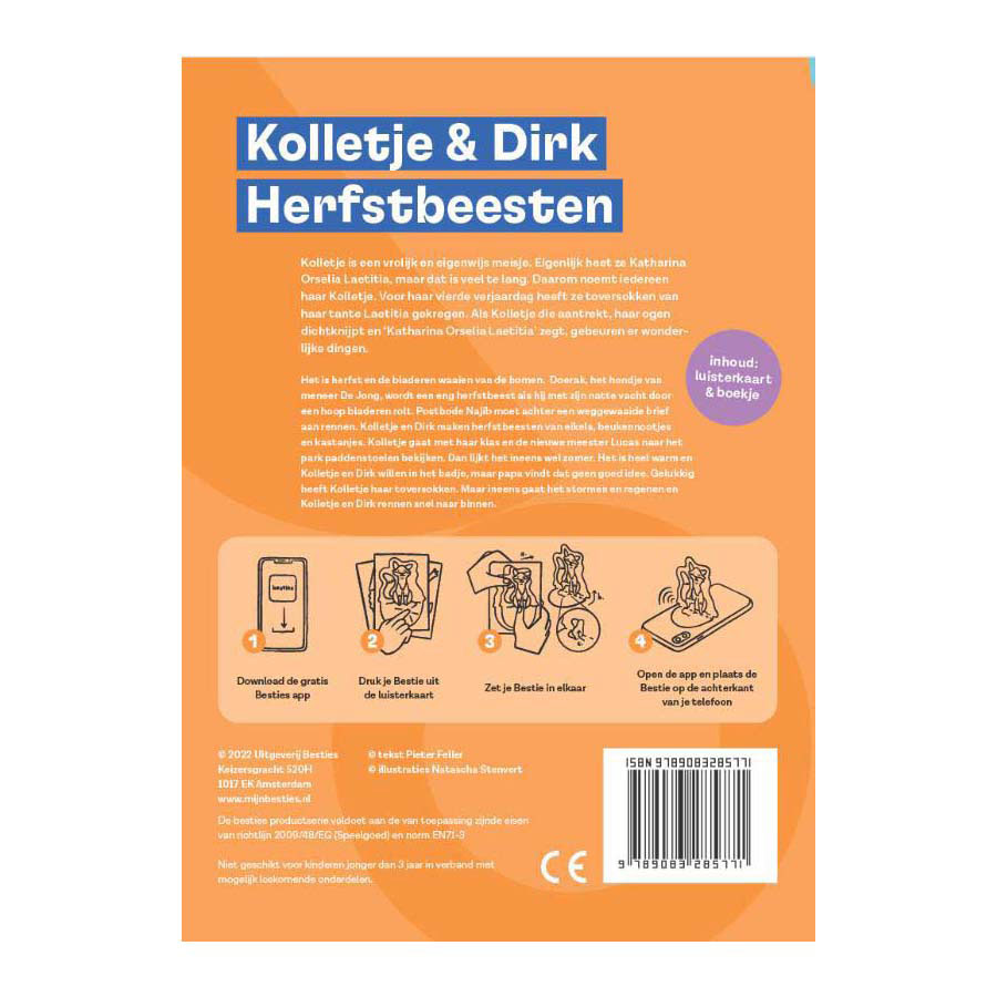 It's autumn and the leaves are blowing off the trees. Doerak, Mr. De Jong's dog, turns into a scary autumn creature when he rolls through a pile of leaves with his wet fur. Postman Najib has to run after a blown-away letter. Kolletje and Dirk make autumn creatures from acorns, beechnuts, and chestnuts. Kolletje goes to the park with her class and the new teacher Lucas to look for mushrooms. Then it suddenly feels like summer. It's very hot and Kolletje and Dirk want to take a bath, but Dad doesn't think that's a good idea. Luckily, Kolletje has her magic socks. But suddenly it starts to storm and rain, and Kolletje and Dirk quickly run inside.