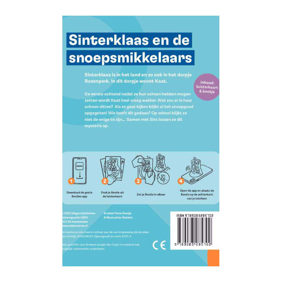 Sinterklaas is in the country and so is the village of Rozenperk. Kaat lives in this village. The first morning after they were allowed to put out their shoe, Kaat wakes up very early. What could be in her shoe? When she goes to look, it turns out that all the candy has been eaten! Who did this? At school, she turns out not to be the only one... Together with Sint, they solve this mystery. How does the Besties listening card work? - Download the free Besties app - Press your Bestie out of the listening card - Assemble your Bestie - Open the app and place the Bestie on the back of your phone. Enjoy listening!