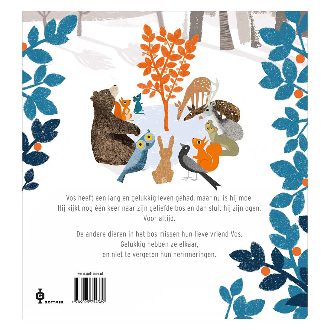 The other animals in the forest miss their friend and come together to reminisce about beautiful memories of Fox. Without realizing it, a small plant starts to grow where Fox is lying under the snow. With every memory, the plant becomes bigger and more beautiful, until there is a huge tree in the middle of the forest. A tree full of memories of Fox.