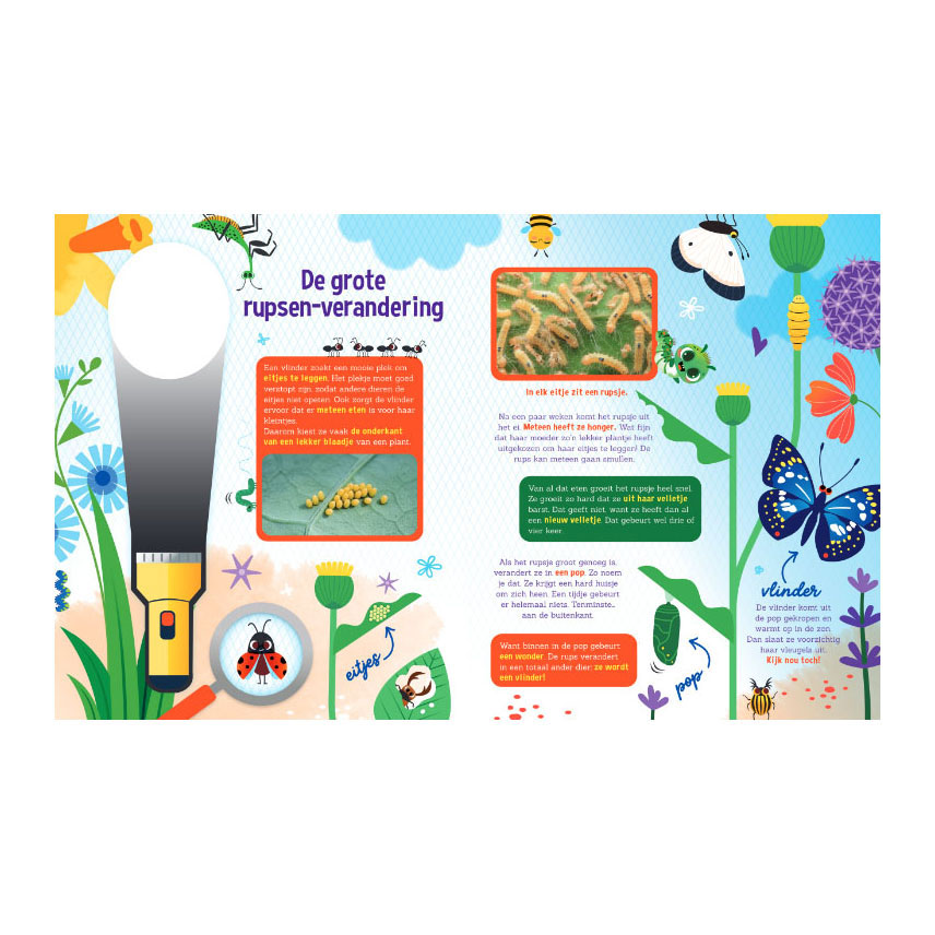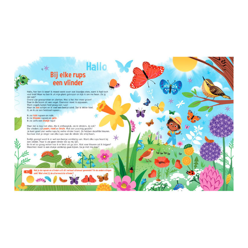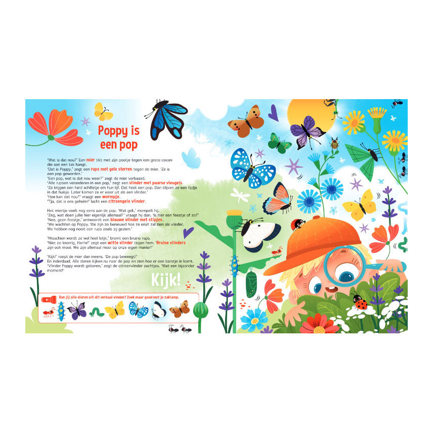 Join Poppy the caterpillar on an adventure! In this cheerful search-and-find book, you will discover how a little caterpillar transforms into a beautiful butterfly. Poppy is curious and wants to know everything about the world around her. Will you help her search for the answer to her big question: what does a butterfly look like? With the sturdy cardboard "flashlight" that comes with the book, you can go on a journey of discovery yourself. Slide the flashlight behind the pages and watch all kinds of hidden surprises appear! A magical reading experience that will keep young detectives captivated. This beautifully illustrated book combines play and education: children learn about the metamorphosis from caterpillar to butterfly and are encouraged to look, search, and discover. Perfect for curious toddlers and preschoolers aged 3 and up. An exciting and educational adventure that parents and children can experience together. Ideal as a gift and guaranteed to provide hours of play and reading fun! Will you also check out the other titles in this series?