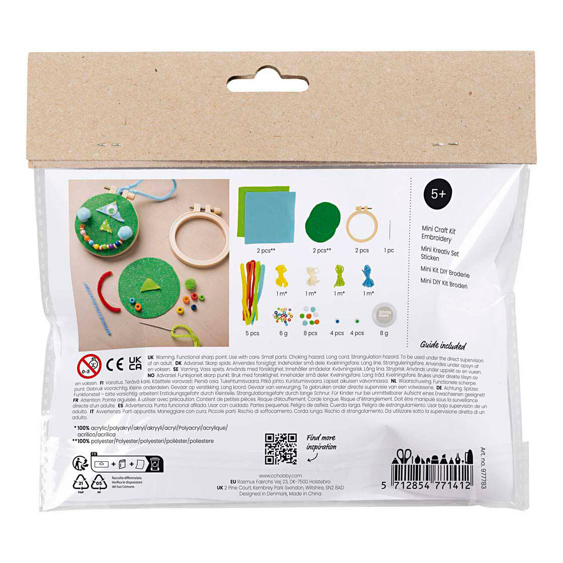 Contents: Embroidery hoop, embroidery needle, felt, yarn, beads, pipe cleaners, pom-poms, googly eyes, glue.