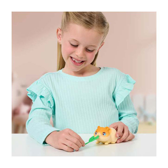 Have you always wanted a pet? Look how adorable this little hamster is in her pink mini-hutch! And this hamster will become a mom... but when? Take good care of Mom and feed her celery, and her eyes will close. Then place her on the straw in her hutch and close the door. Fill the water bottle and watch the water disappear! Now she's ready to magically have two babies! But if you're lucky, maybe three or even four! These adorable baby hamsters have different poses and come with surprising accessories, a bow, or a bib. Don't forget to fill out the birth certificate!