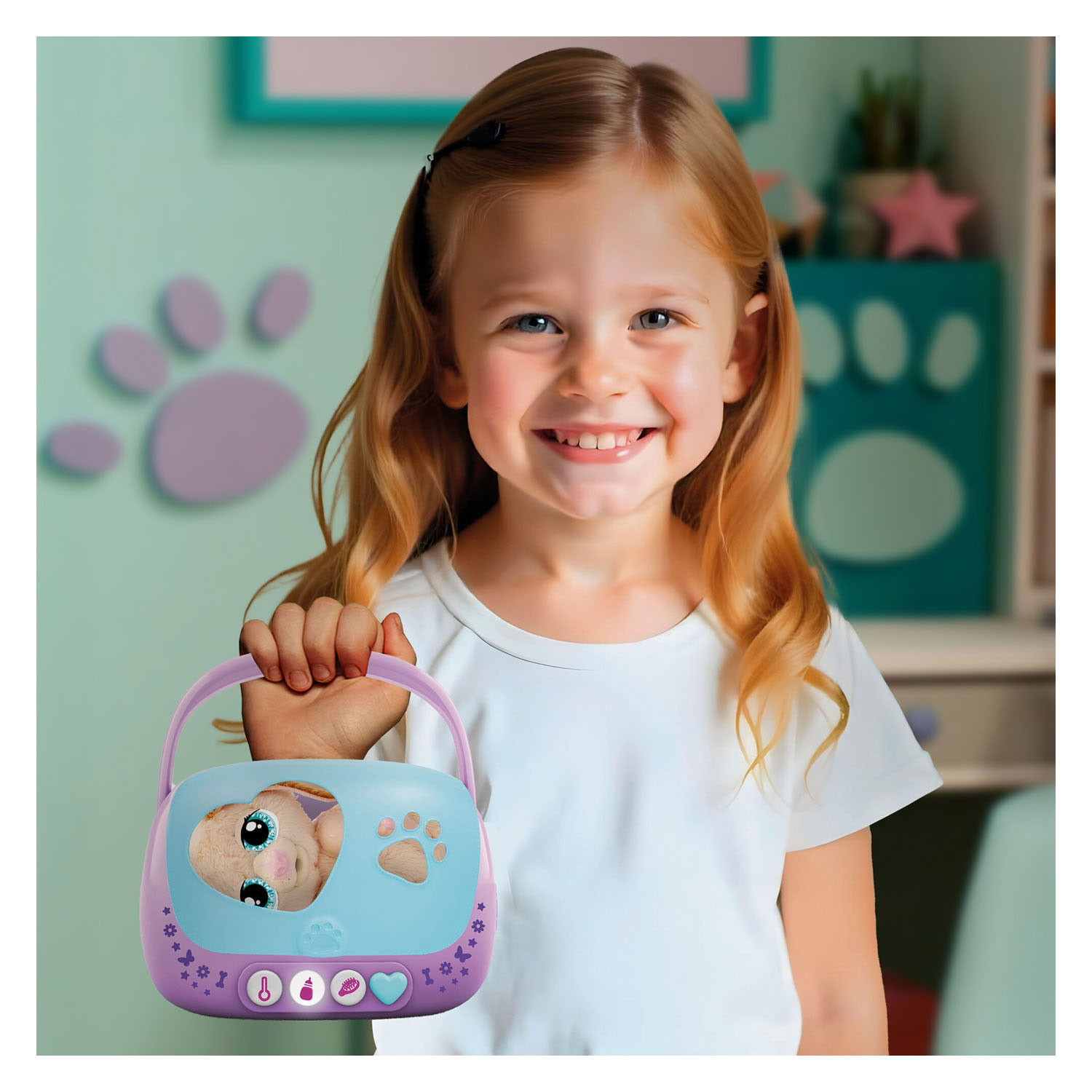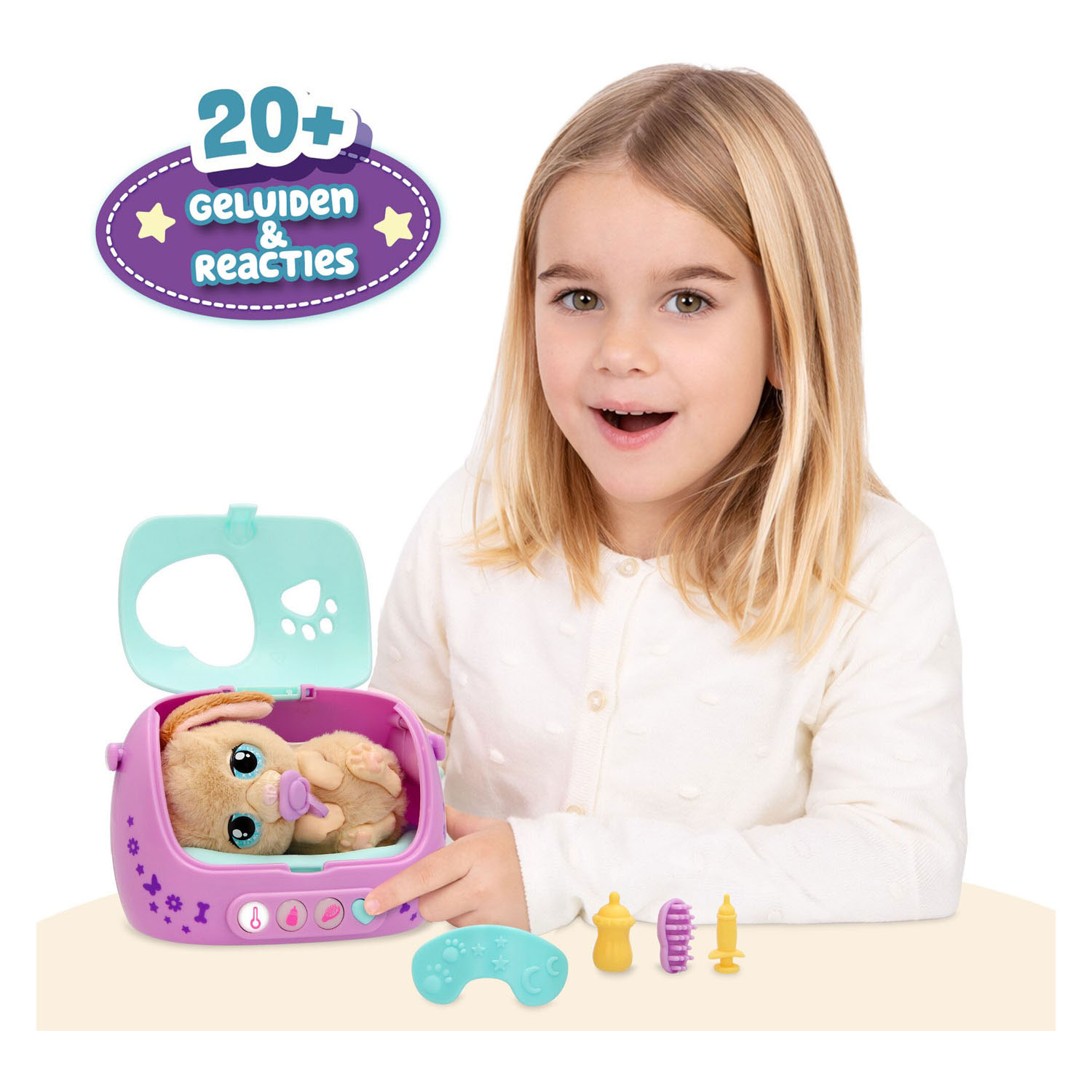 Baby Paws Just Born – Your Newborn Puppy This adorable Baby Paws Just Born has just been born and needs your love and care to grow! This sweet little pup responds to your care and lets you know exactly what he needs. Press the heart button and one of the lights will light up, showing you what your newborn friend needs to be happy. Grab the right accessory and care for your puppy with love. Give medicine with the syringe, feed him with the bottle, or make him look pretty with the brush. This interactive set features over 20 reactions and sounds, making playtime extra fun and lifelike. Is your puppy tired? Hold down the button to activate sleep mode, put on the cute sleep mask, and let your little friend fall asleep peacefully. Afterwards, you can take him anywhere in his cute basket with a handle. A loving play experience where children playfully learn to care for, comfort, and play with their own little puppy, while using their imagination and developing their sense of responsibility. Age indication: 3 years+. Battery information: 3 x AAA batteries (not included).