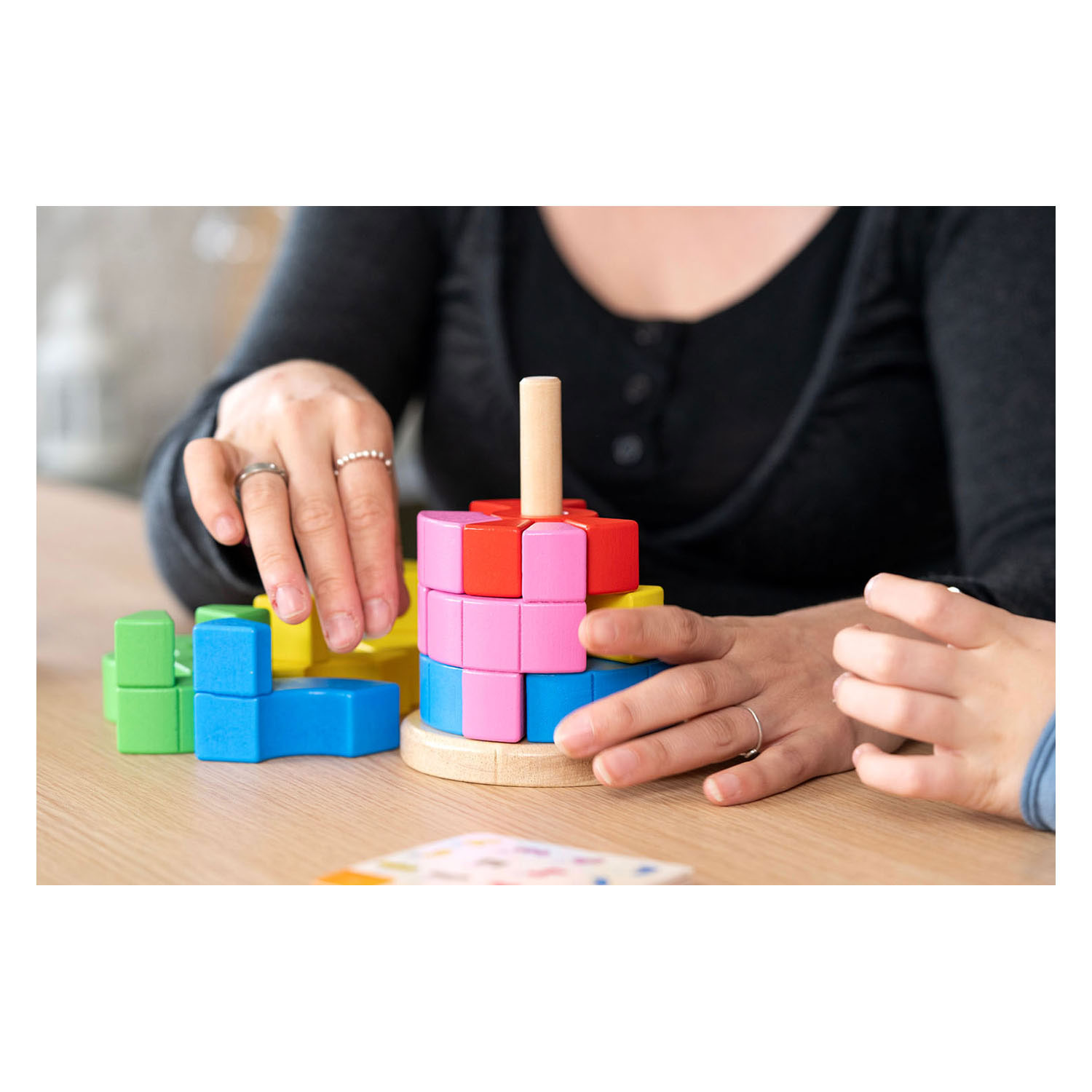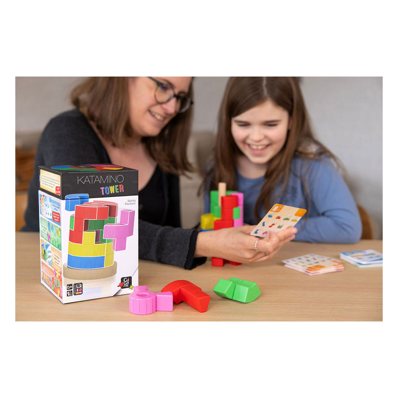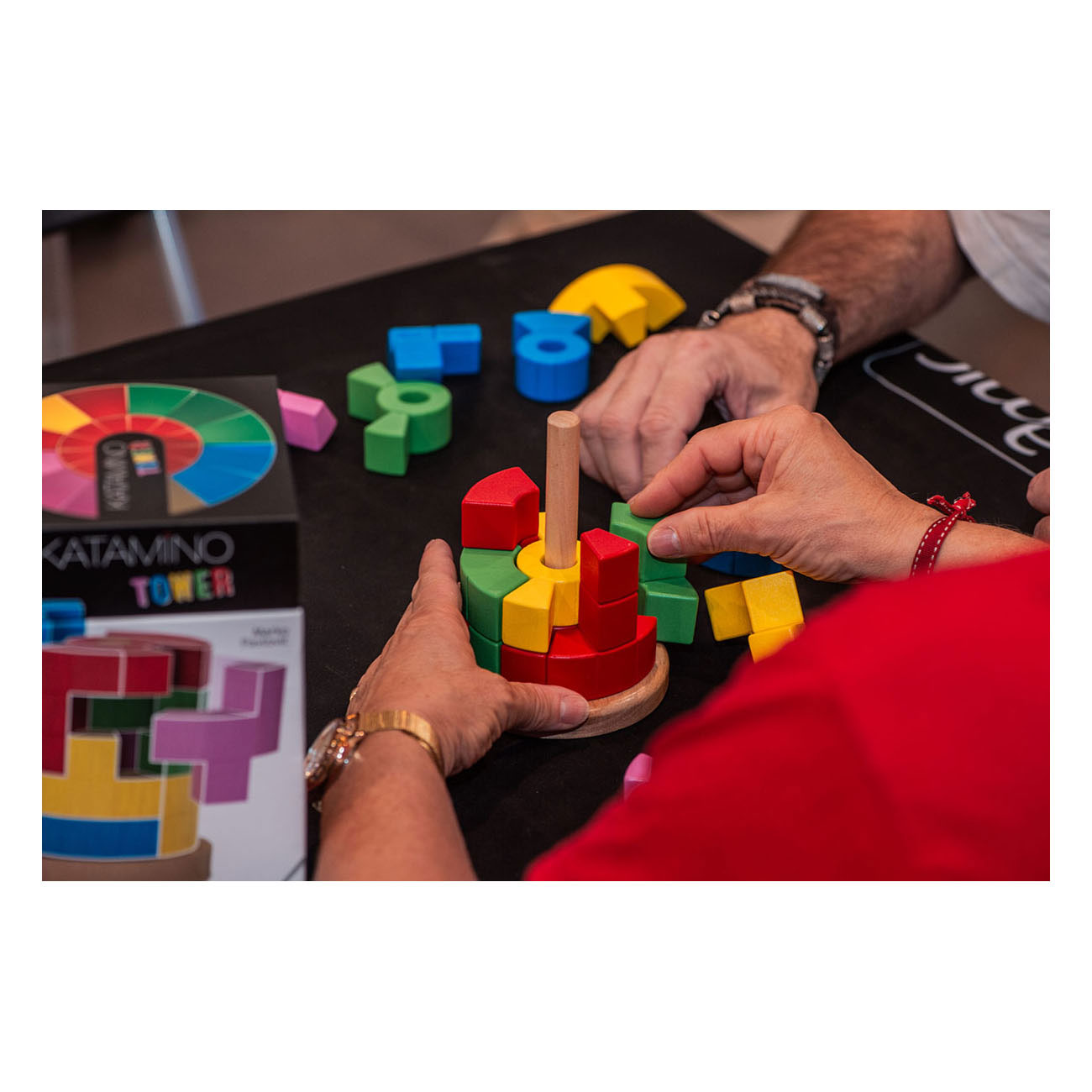 Katamino Tower is a 3D puzzle game with wooden pieces in which players build towers of different levels. The game can be played solo or with two players and features multiple game modes and thousands of puzzle combinations. Made of wood, with rules in multiple languages and suitable for 1 to 2 players aged 6 and up.