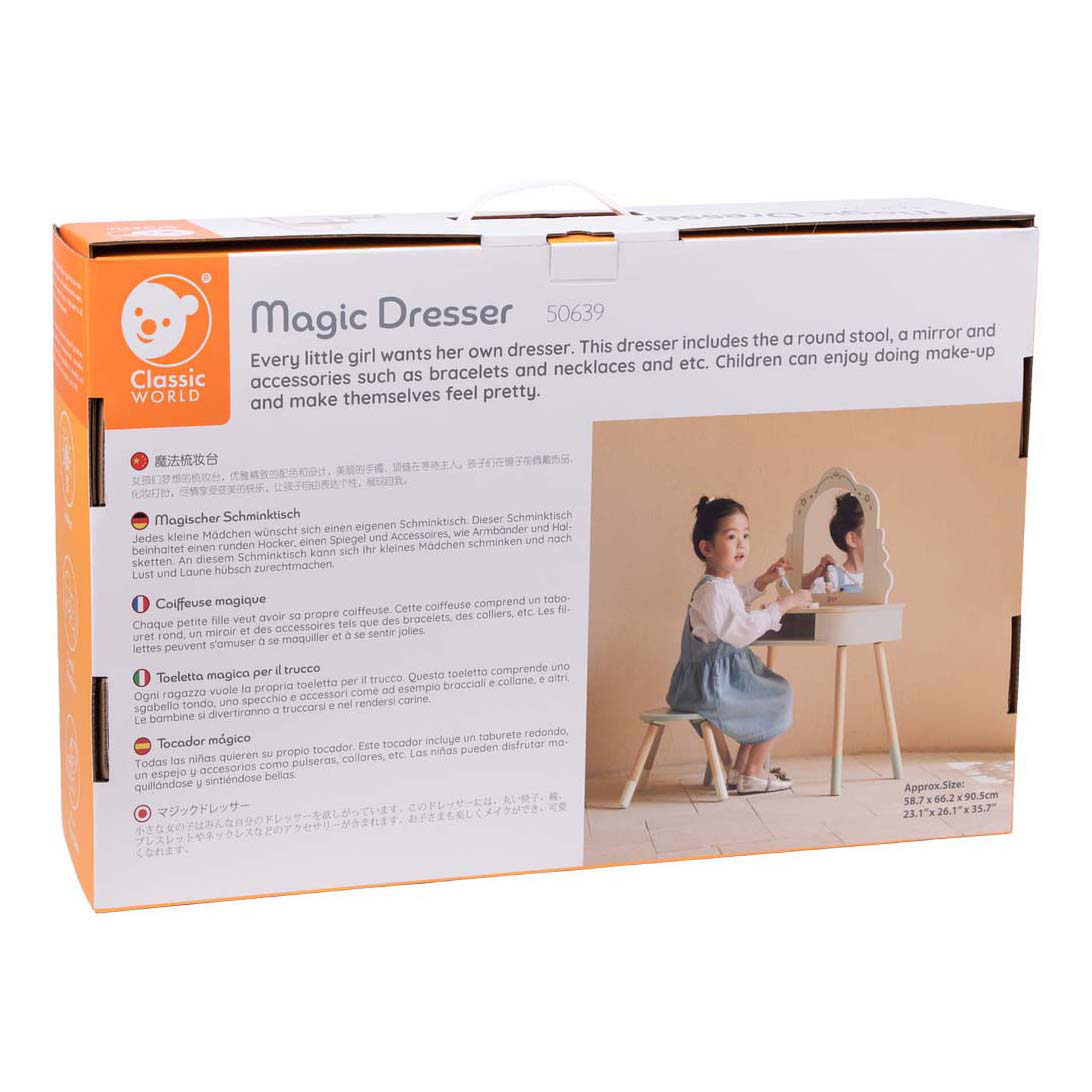 Classic World wooden dressing table with a mirror, stool, and jewelry accessories. The set includes a necklace, bracelet, rings, and hair clips so children can get ready and enjoy role-playing. Made of wood and suitable for children ages 8 and up. A beautiful dressing table for imaginative play.