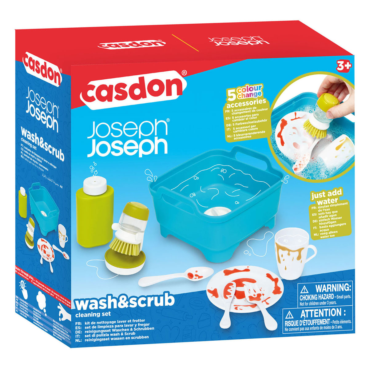 This colorful dishwashing set contains everything your little one needs to pretend to do the dishes themselves, including a blue washing-up bowl that can be filled with real water. The palm scrubbing sponge and soap bottle included in the set are perfect for getting the dishes sparkling clean, while the plate, mug, and cutlery add a touch of realism. But the best part of this dishwashing set is the color-changing cutlery and tableware! Your little one will be fascinated watching the dishes transform from 'dirty' to sparkling clean. Features • Joseph Joseph Wash & Scrub • Stimulates and develops cause-and-effect understanding, fine motor skills, and coordination • Suitable for children aged 3 and up • Dimensions: 25 x 16 x 8 cm
