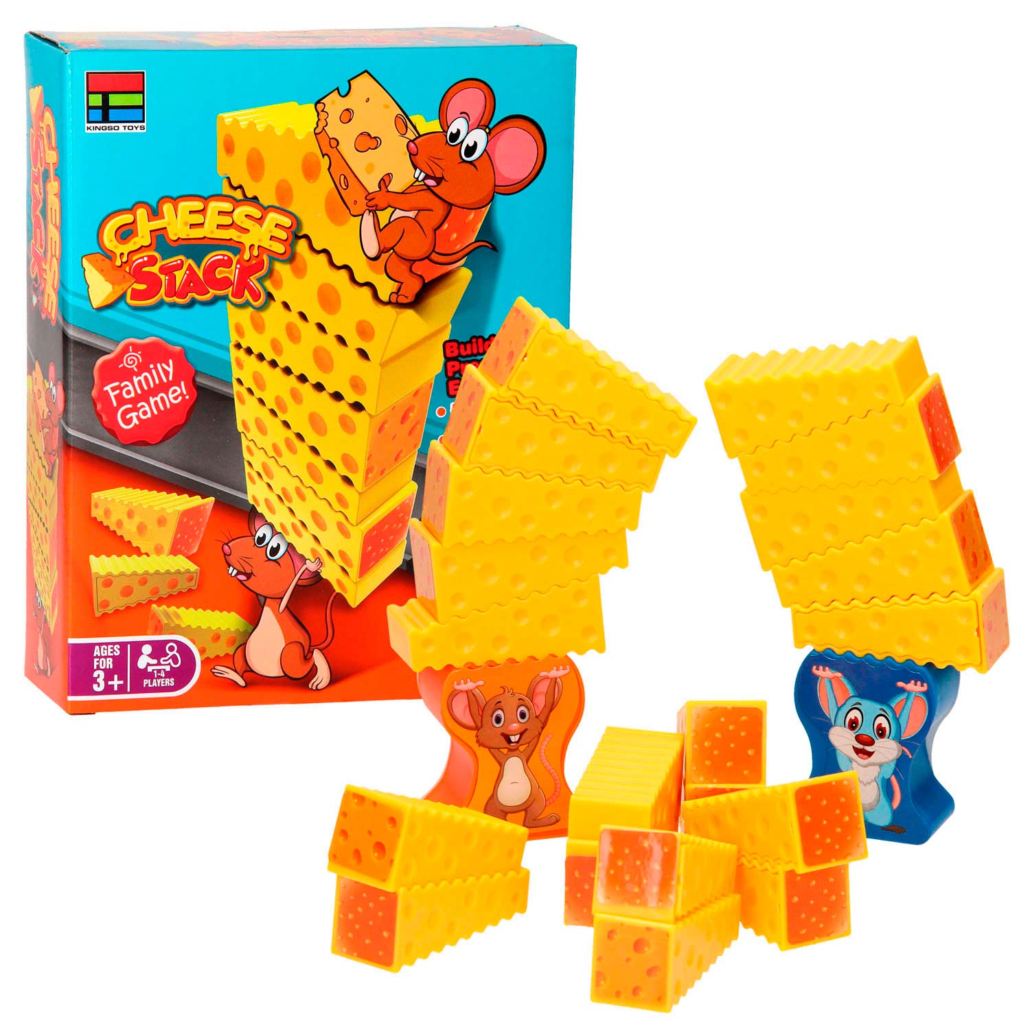 Play three different versions of this stacking game. Game 1: Place one of the mice in the middle of the stack and divide the cheese pieces evenly among the players. Each player takes turns placing a cheese piece on the mouse. If the pieces fall on your turn, the fallen pieces are yours. The first person to place all their cheese pieces on the mouse wins!