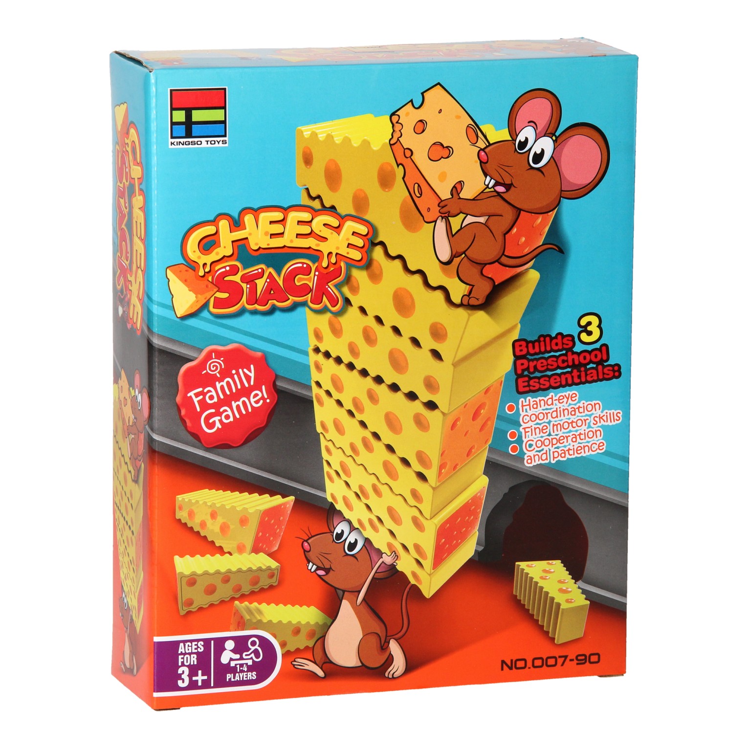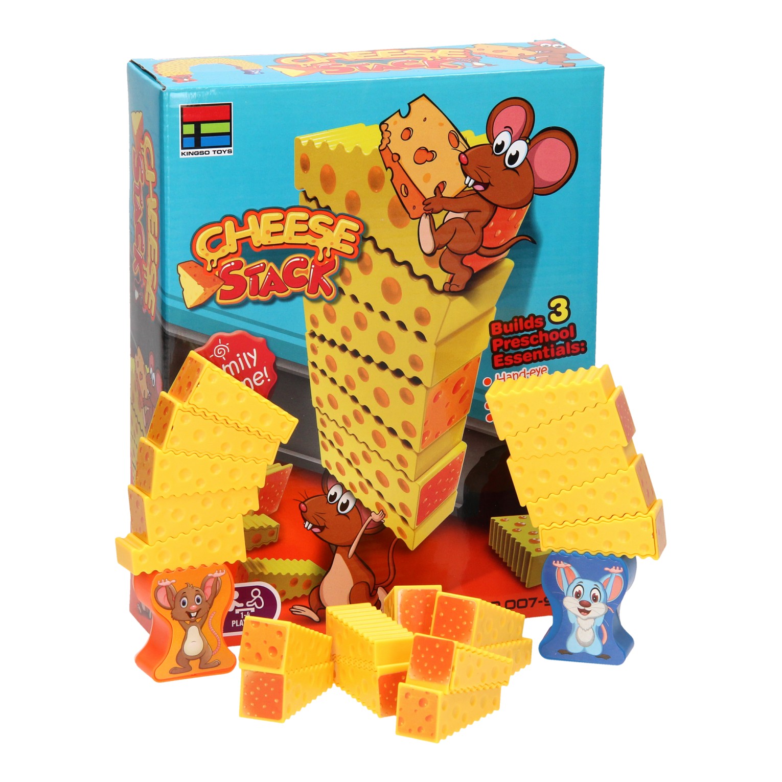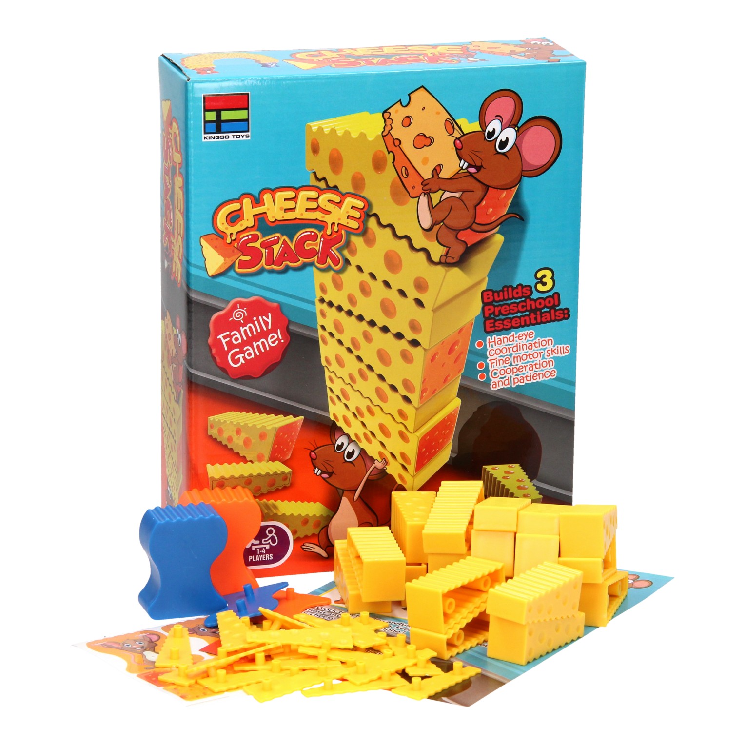 The stacking game trains hand-eye coordination, fine motor skills, patience, and teamwork. You can play this game with one to four people. Contents: two mice, twenty pieces of cheese, stickers to cover the game pieces and the instructions for all three games.