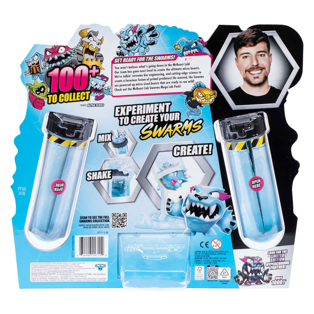 Create beastly MrBeast Lab Swarms! Get ready for the ULTIMATE experiment as 12 chaotic MrBeast inspired microbeasts are released. Add water to the test tube, shake vigorously and watch as two Swarms microbeasts emerge from a fizzing mixture. Each pack contains 12 Swarms including the Special Edition Hard Head Panther. With over 100 unique 1 inch MrBeast Swarms to collect including the rare and coveted Hyperchrome Panther. But hurry, there are only 1000 Hyperchrome Panthers available to create. Each Micro Beast belongs to a different team such as Home Horrors & Techno Terrors. Embrace the chaos, mix, shake, create and embark on an exciting experimental journey with the MrBeast Lab Swarms! Age rating: 5 years+.