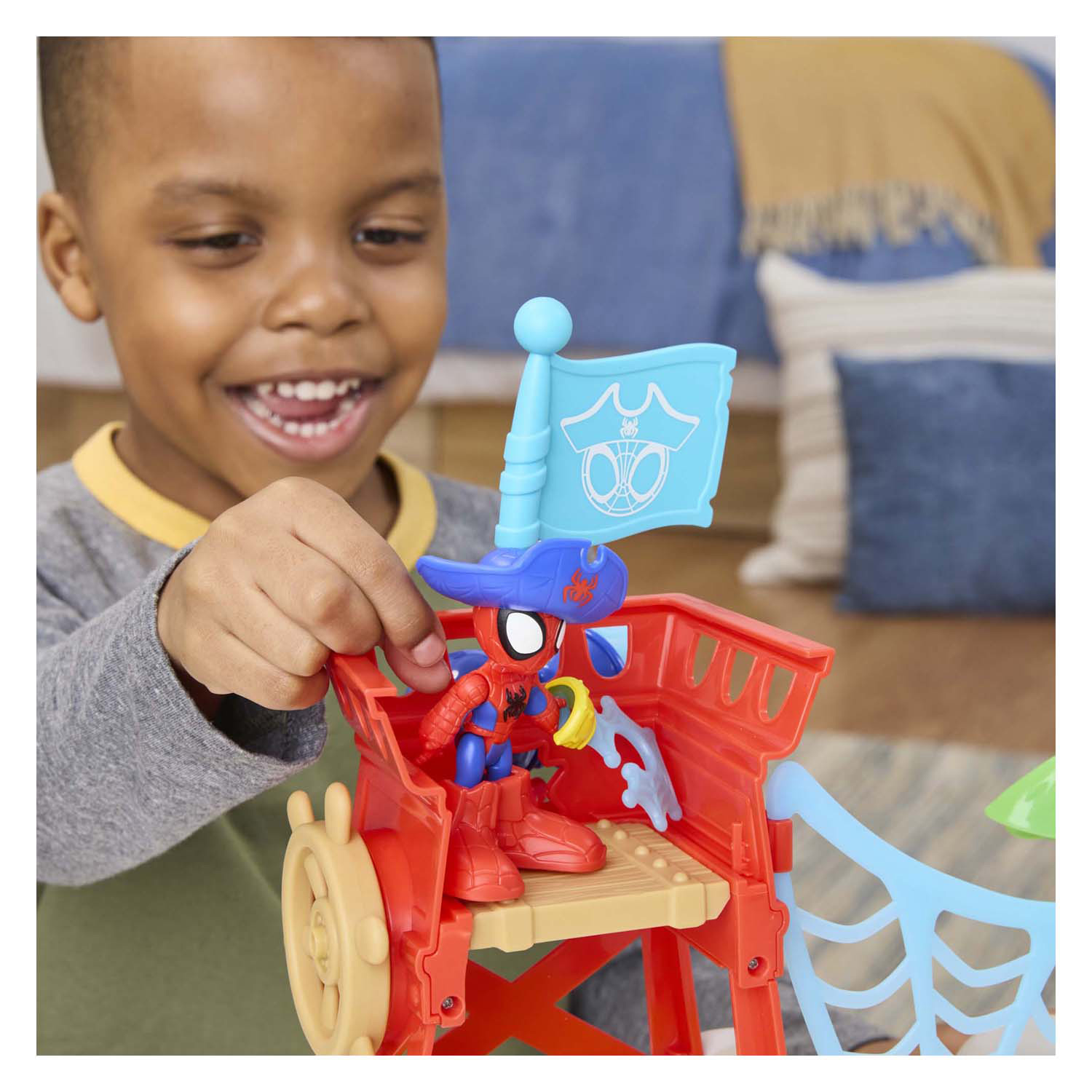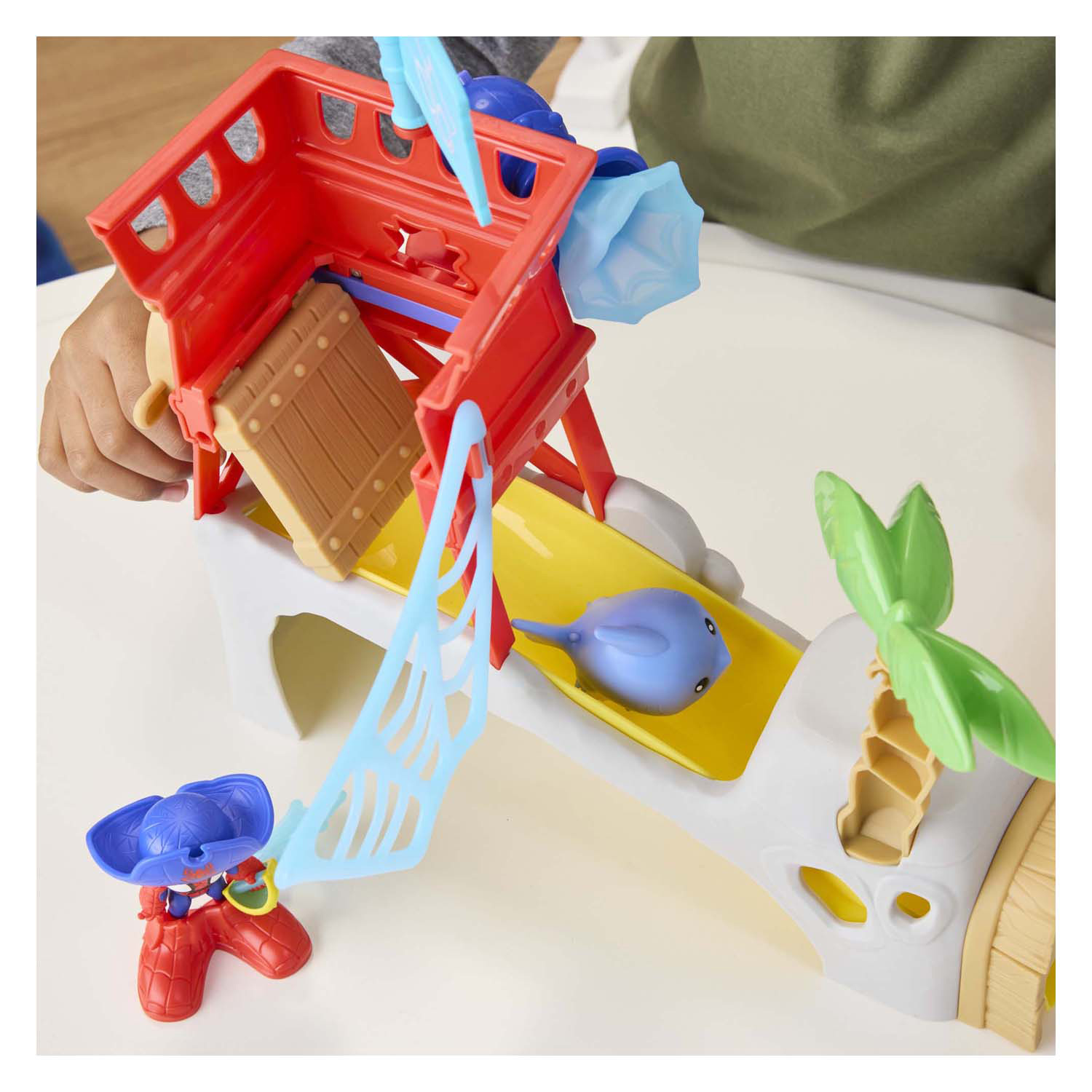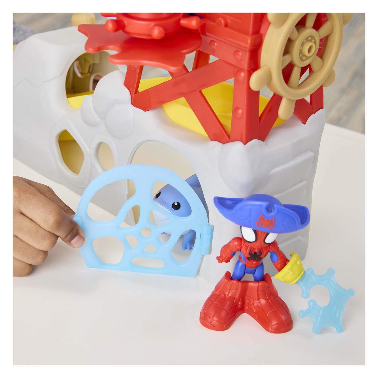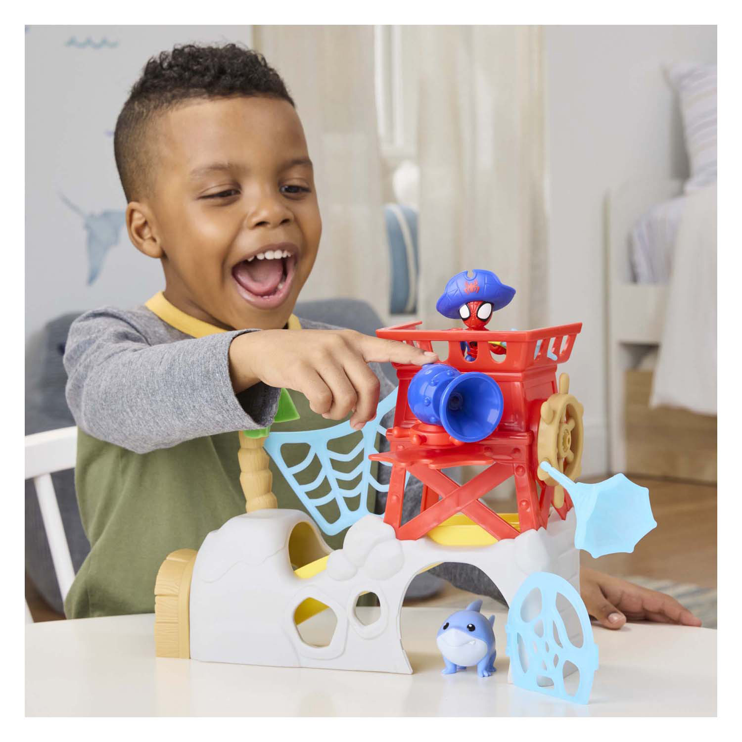 Kids can dream up action and adventure with the Marvel Spidey and his Amazing Friends Water-Webs Spidey Island from Hasbro! The playset includes a 3-inch posable Spidey figure, a Jeff the Landshark figure, and a trapdoor with a slide, a cave door and more. Transform Spidey into Pirate Spidey with detachable accessories like a pirate hat, boots and a hook. The set also includes a detachable palm tree, a flag and a web shooter that the Spider-Man action figure can hold in its C-shaped handle! Encourage imaginative pirate adventures for boys and girls aged 3 and up with the Marvel Spidey and his Amazing Friends toy range, including figures, toy vehicles and playsets! Cool Marvel toys make great gifts for kids for birthdays or other special occasions! (Each sold separately. Subject to availability.) Copyright MARVEL. All trademarks and registered trademarks are the property of their respective owners. HASBRO and all related trademarks and logos are trademarks of Hasbro, Inc.