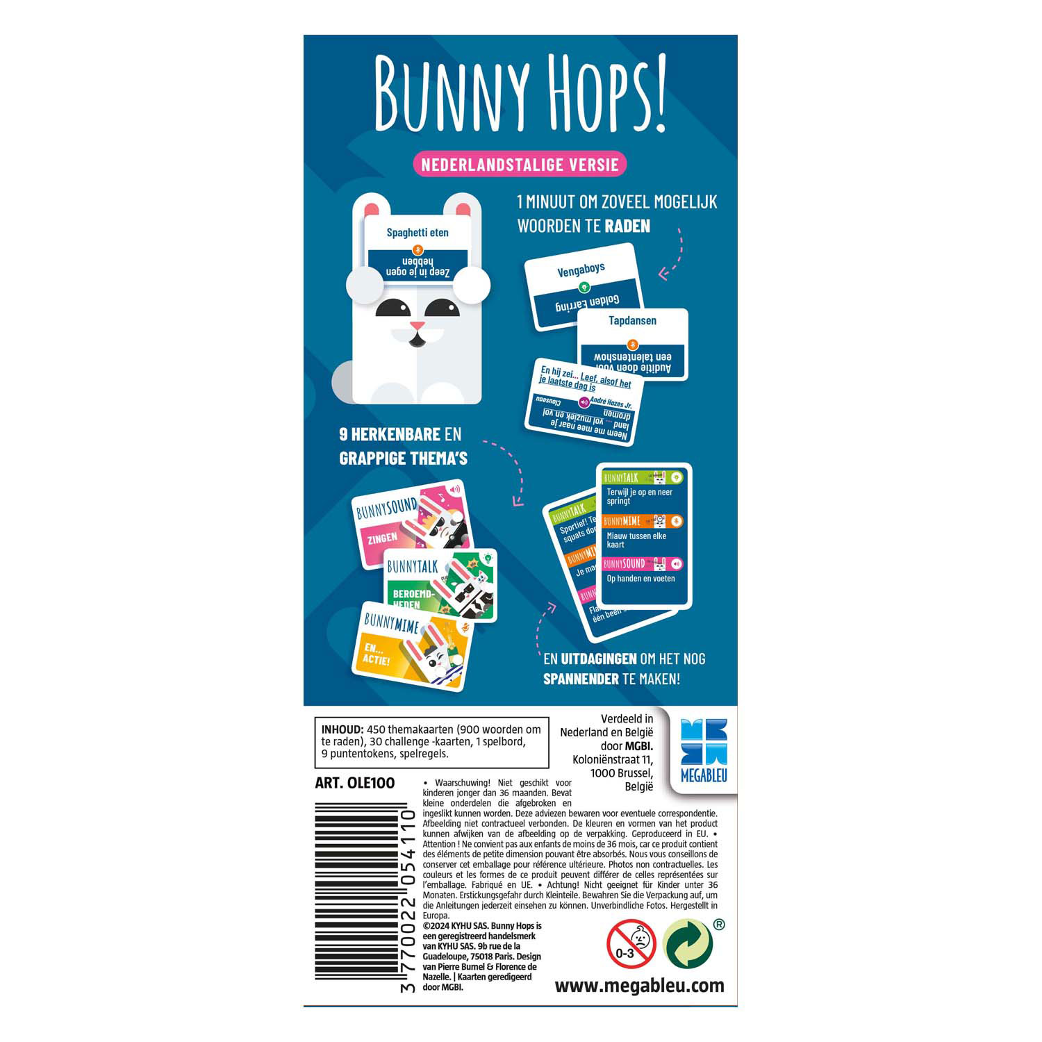 Contents: 450 theme cards, 30 challenge cards, 9 tokens, 1 game board, game rules.