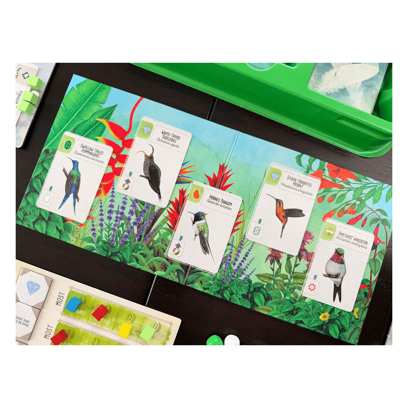 The fourth expansion for Wingspan brings hummingbirds and 111 unique birds as well! In this expansion to Wingspan, the beautiful hummingbirds take center stage! With special game rules, these quick little birds make the game even more exciting. Furthermore, this diverse region features both the birds with the smallest and the largest wingspans in the world! You won't want to miss these amazing birds!