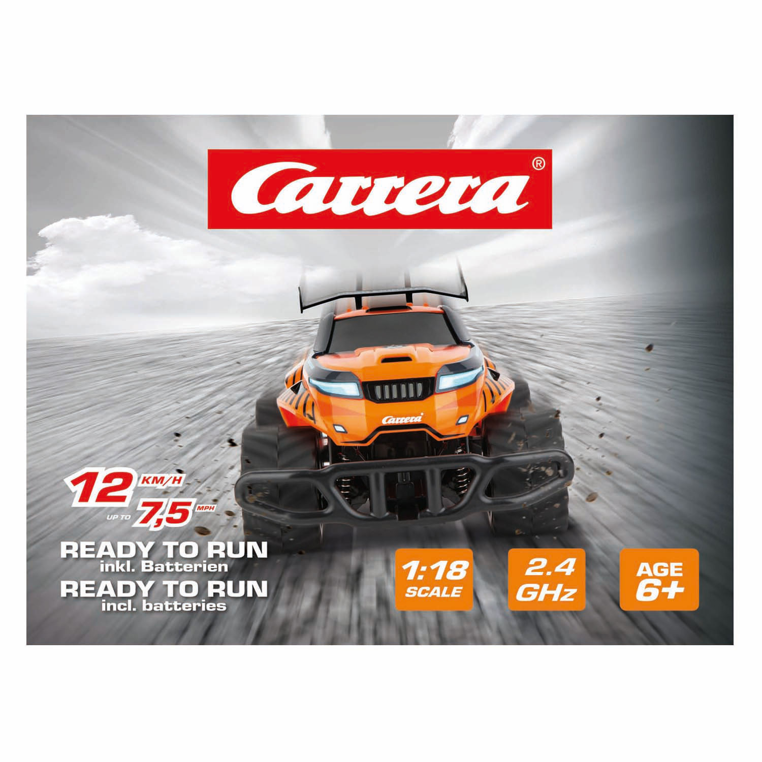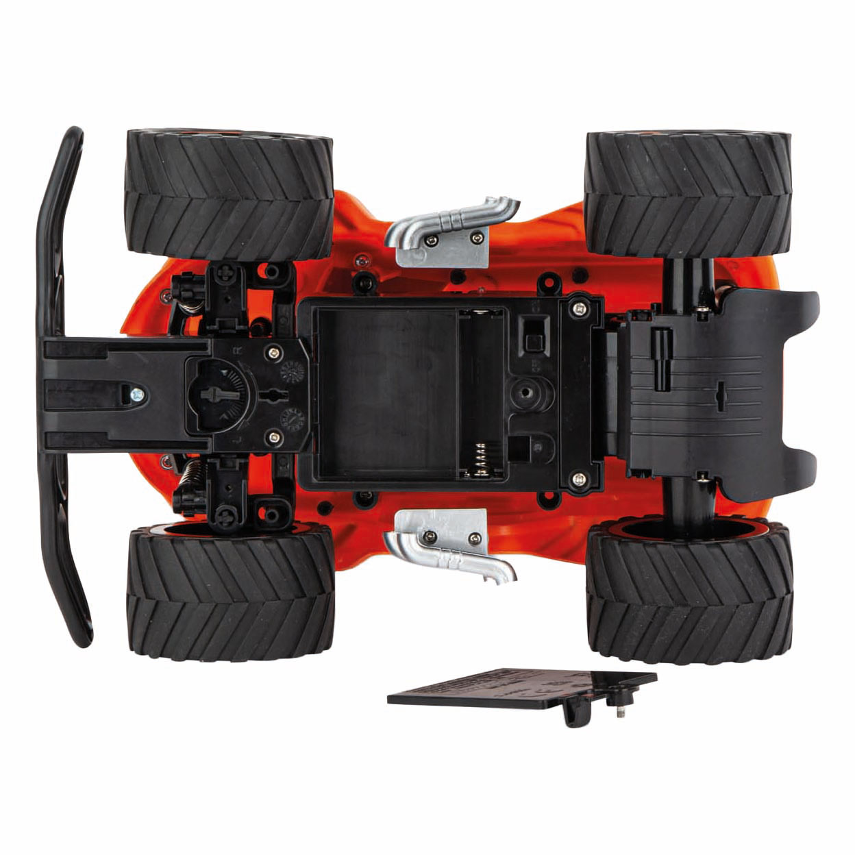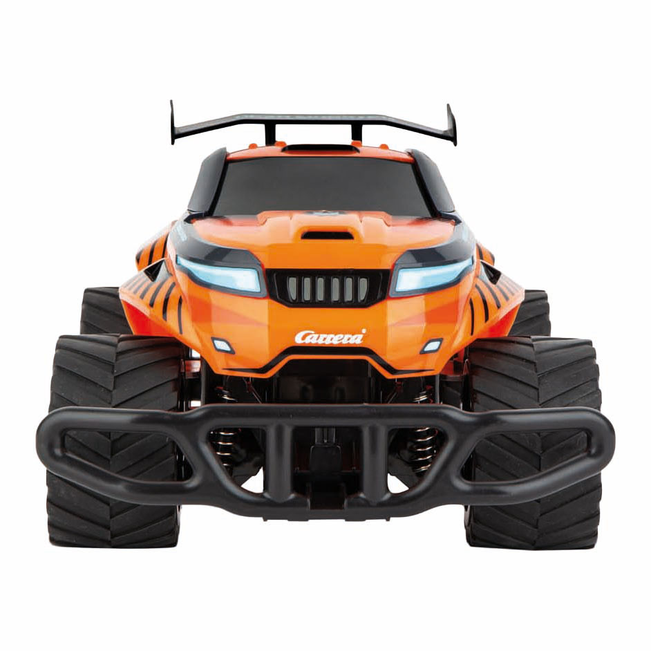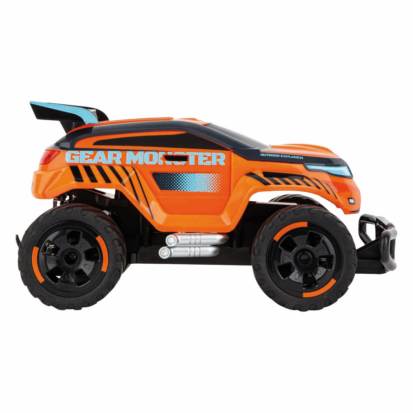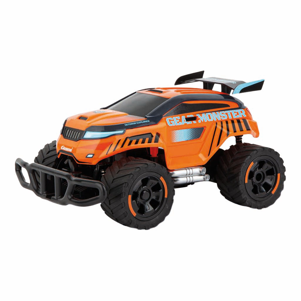 The Carrera RC Gear Monster 3 makes any terrain unsafe. This mighty off-roader in bright orange is equipped with large pneumatic tires that carry it over hills and dale on cool rides. Whether on rocky paths or rolling meadows, the 28 cm long off-roader shines at top speeds of up to 12 km/h (7.5 mph), bringing plenty of speed to every adventure. Thanks to the precise Full Function controls, spectacular maneuvers and agile changes of direction are guaranteed. Up to 16 vehicles can compete simultaneously in exciting head-to-head races, while the rechargeable battery provides up to 2 minutes of pure action. With its striking orange design and new USB-C battery, the Gear Monster 3 is always ready to embark on your next adventure.