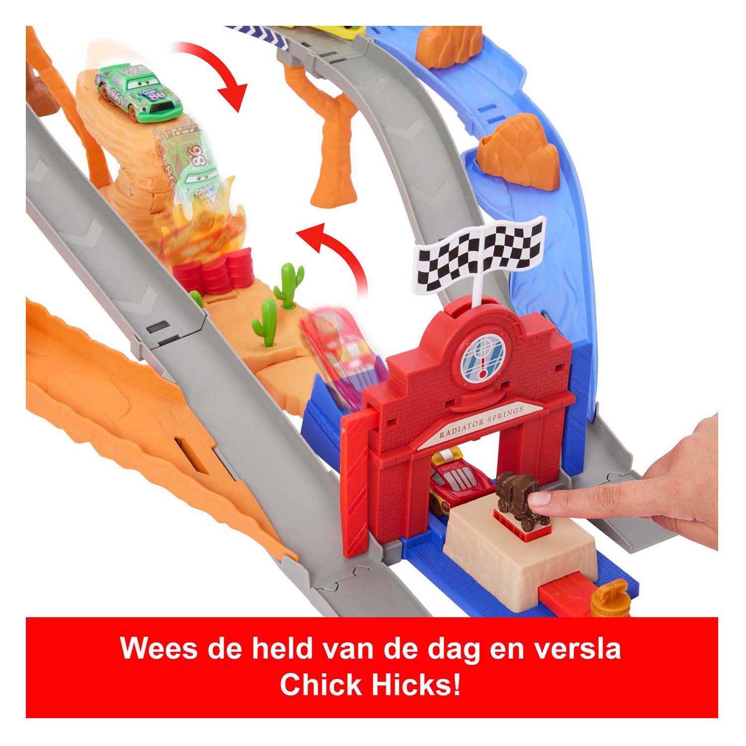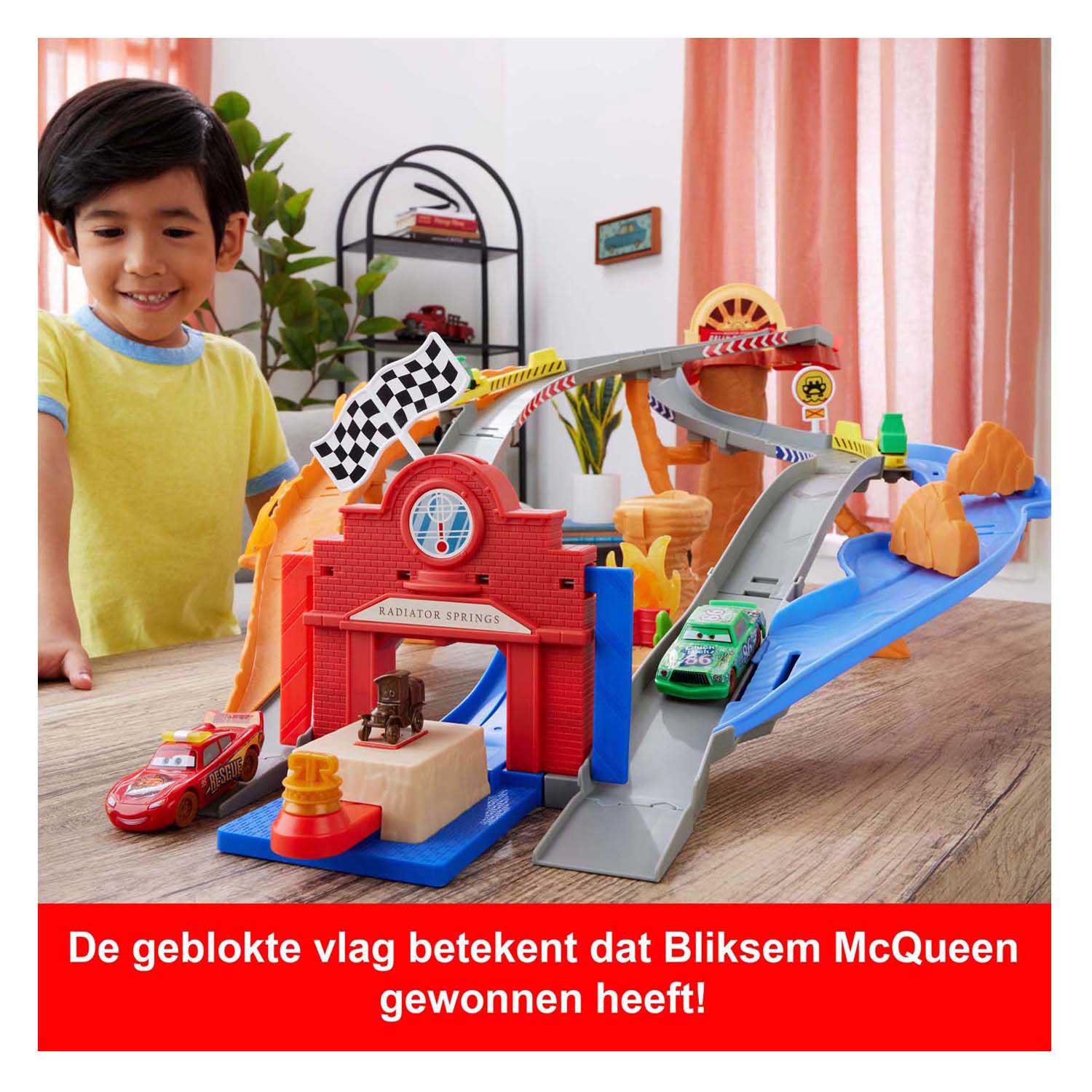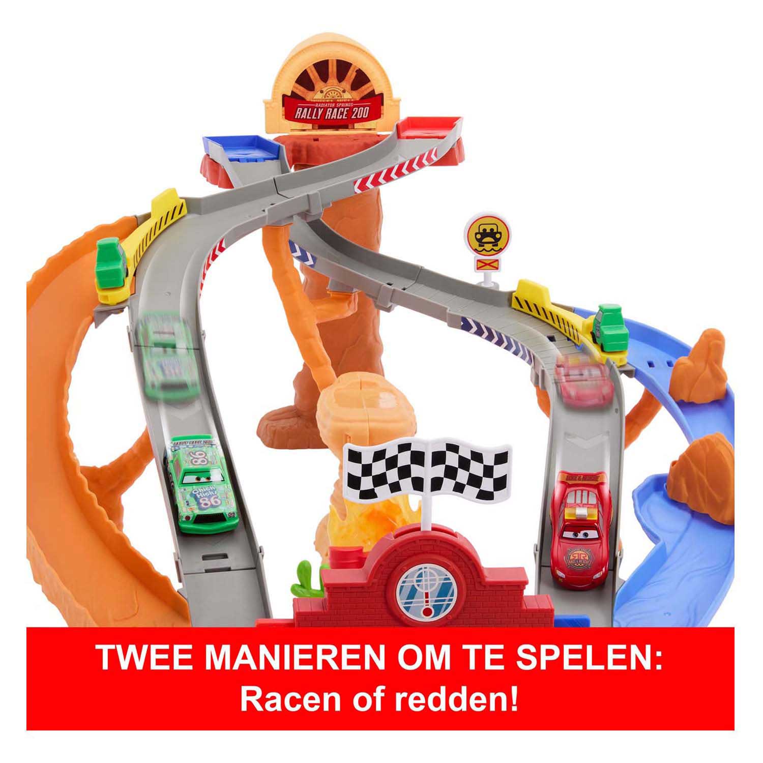 Chick Hicks and his Pit team are causing all sorts of trouble at the Radiator Springs Rally Race 200, so it's up to Lightning McQueen to the rescue. With the Disney and Pixar Cars Rescue Road Racetrack playset, you can play two ways: let Lightning McQueen race against Chick Hicks, or let Lightning McQueen save the day by being a true hero and clearing the tracks. The set also includes two Pit characters to create even more exciting stories. Colors and decorations may vary.