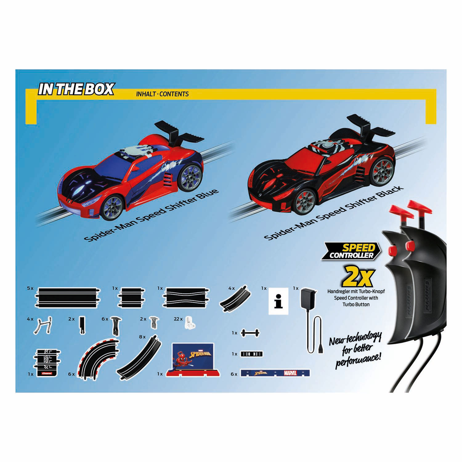 In the Carrera GO!! "Spider Racing" set, the red Spider-Man Speed ​​Shifter faces off against his black opponent—making for a challenging duel on the 4.9-meter/16.7-foot track. The loop adds a dose of action; the straights are full throttle, and the challenging curves put the drivers' skills to the ultimate test. Young racers aged 6 and up will have to prove themselves to be the first to master the challenging narrow passage and stay ahead in the duel. For an extra burst of speed, the included hand controllers are equipped with Turbo Boost—but only those who can hold their nerve will ultimately emerge as the ultimate winner.