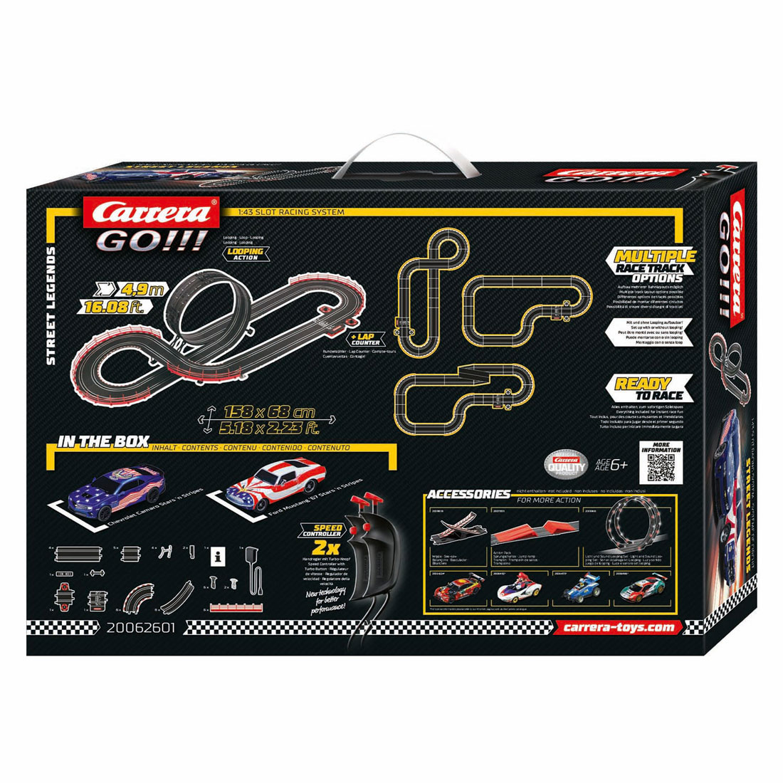 With the Carrera GO!!! "Street Legends," two of the most famous muscle Cars in history take to the track. The '67 Ford Mustang Stars 'n Stripes and the Chevrolet Camaro Stars 'n Stripes face off in a thrilling duel on the 4.9-meter-long track. The original cars will get any racing fan's pulse racing, delivering a thrilling race where every corner and straight is contested down to the last second. Circuit elements like loops and tight turns demand complete concentration and lightning-fast reflexes from the drivers. With the manual controls and turbo button, every drive becomes a high-speed challenge that transforms the living room into a thrilling racing arena—always chasing the best time.