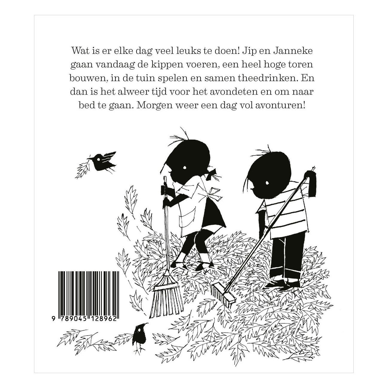 Stevig prentenboek met verhalen over een dag uit het leven van Jip en Janneke. Na het ontbijt gaan ze naar buiten met Takkie en Siepie. Ze helpen in huis met stofzuigen, wat toch lastiger blijkt dan gedacht. Natuurlijk spelen ze samen, wordt er gegeten en - moet er een verhaaltje voorgelezen worden voor het slapengaan!