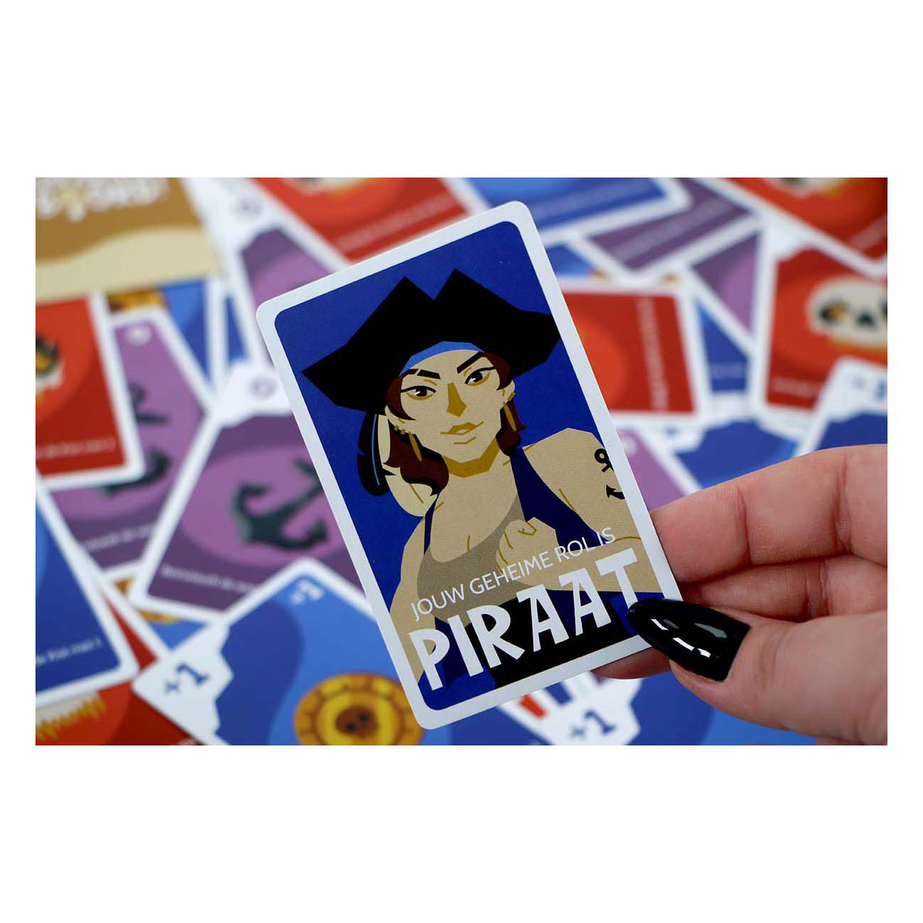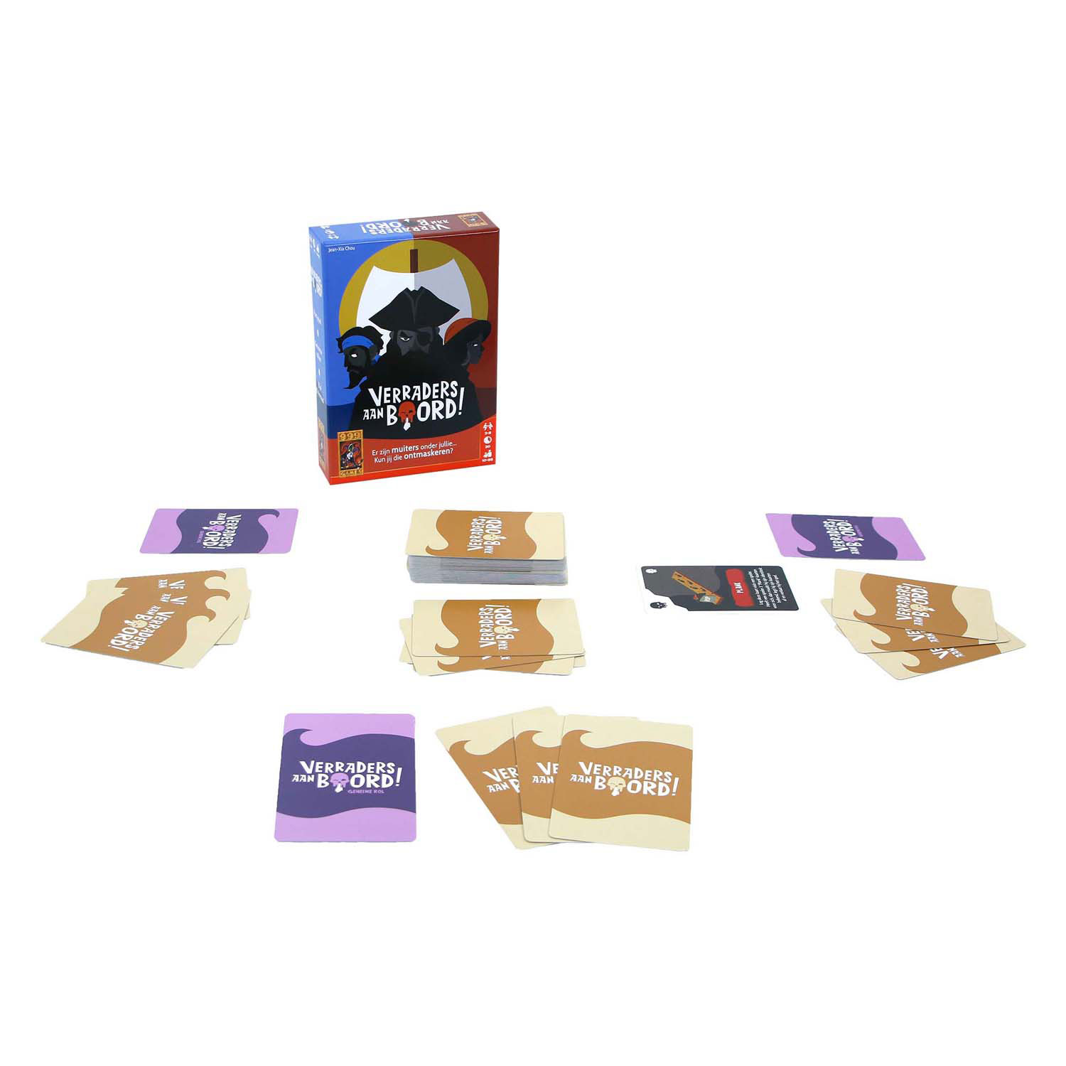 Muiters en piraten strijden om de buit in deze spannende party game vol bluf, deductie en interactie!  Muiters hebben de schatkist leeggeroofd om te voorkomen dat de buit wordt verdeeld! Het is nu aan de piraten om ze te ontmaskeren. Speel je kaarten slim om het geld terug in de kist te krijgen, of saboteer juist de hele boel. Stel de juiste vragen, deel de juiste informatie en gebruik sterke voorwerpen in deze spannende party game! Lukt het je om de kist weer te vullen voordat de muiters er met de buit vandoor gaan?    Waarom wil je dit spelen? Sociaal deductiespel waaraan iedereen mee kan doen. Eenvoudige spelregels zorgen ervoor dat je snel kunt beginnen. Je bent nooit helemaal uitgeschakeld, want je kunt ook als je overboord bent je team helpen om te winnen.    Wie speelt er Verraders aan Boord!?  Verraders aan Boord! is een zinderende party game voor fans van sociale deductiespellen. De eenvoudige spelregels bieden alle spelers een kans om voor de winst te gaan, maar de juiste tactiek hanteren en slimme vragen stellen is de echte sleutel tot succes. Ga de strijd aan in groepen tot wel 8 personen en breng de spanning van het piratenleven naar jouw tafel!    Hoe speel je Verraders aan Boord!?  Iedere speler krijgt in het geheim te horen of hij een piraat of een muiter is. Vervolgens moeten de piraten proberen zo veel mogelijk geld in de schatkist te krijgen terwijl de muiters proberen de boel te belazeren. In je beurt speel je een kaart die de waarde van de kist kan verhogen, maar ook verlagen. Sommige kaarten zijn voorwerpen waarmee je bijvoorbeeld kunt zien wat andere spelers hebben gedaan. Denk jij zeker te weten dat iemand de boel saboteert, dan kun je ze met wat hulp overboord gooien. Weten de piraten zeker dat de waarde van de kist hoog genoeg is, dan kunnen ze het spel stoppen en winnen. Worden er echter teveel piraten overboord gegooid of is de waarde van de kist te laag, dan winnen de muiters!      Waarom kies je voor Verraders aan Boord! van 999 Games?  Kies voor Verraders aan Boord als je van spannende sociale deductiespellen houdt waaraan iedereen mee moet kunnen doen!  999 Games weet wat leuke spellen zijn, geen saaie beurten tot je eindelijk uit de put komt, eeuwig durende strijd om continenten of eindeloos dobbelen om de laatste straat te kunnen kopen. Ons bedrijf heeft de beste spellen met voor elk wat wils. Van snelle kaartspellen zoals Beverbende, uitdagende dobbelspellen zoals Keer op Keer of Clever tot moderne klassiekers zoals Catan, 30 Seconds, Wingspan en Carcassonne. Bovendien kun je altijd bij ons terecht voor spelregelvragen of als je na aankoop een onderdeel mist. Je krijgt gegarandeerd een antwoord vol speelplezier!