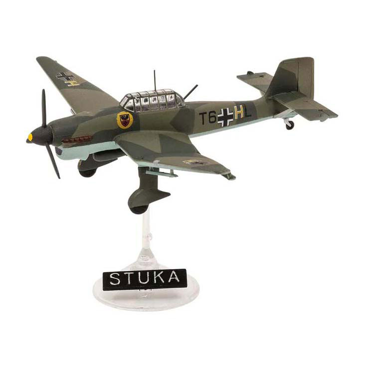 Modelbouwpakket van de Messerschmitt Bf19E en de Junkers Ju87B, inclusief standaard. Schaal 1:144. 39 onderdelen. 6 cm en 8 cm lang. Geschikt vanaf 1 jaar.
