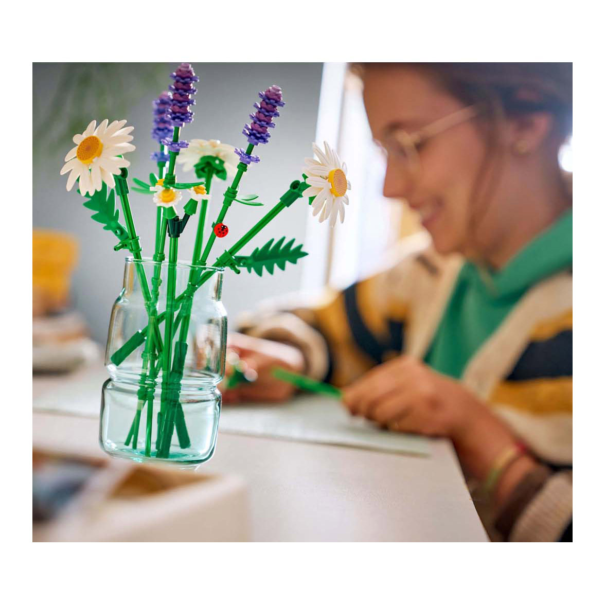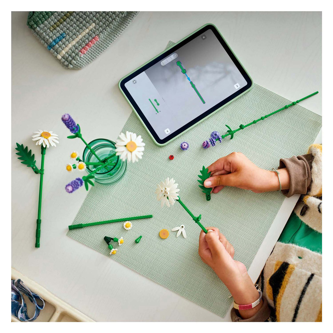 LEGO® BLOEMENBOEKET – jonge bloemisten zullen veel plezier beleven aan het bouwen van 3 grote madeliefjes, 2 stengels met kleine madeliefjes, 3 rustgevende lavendeltakken en groene stengels