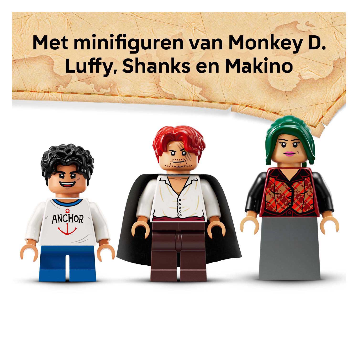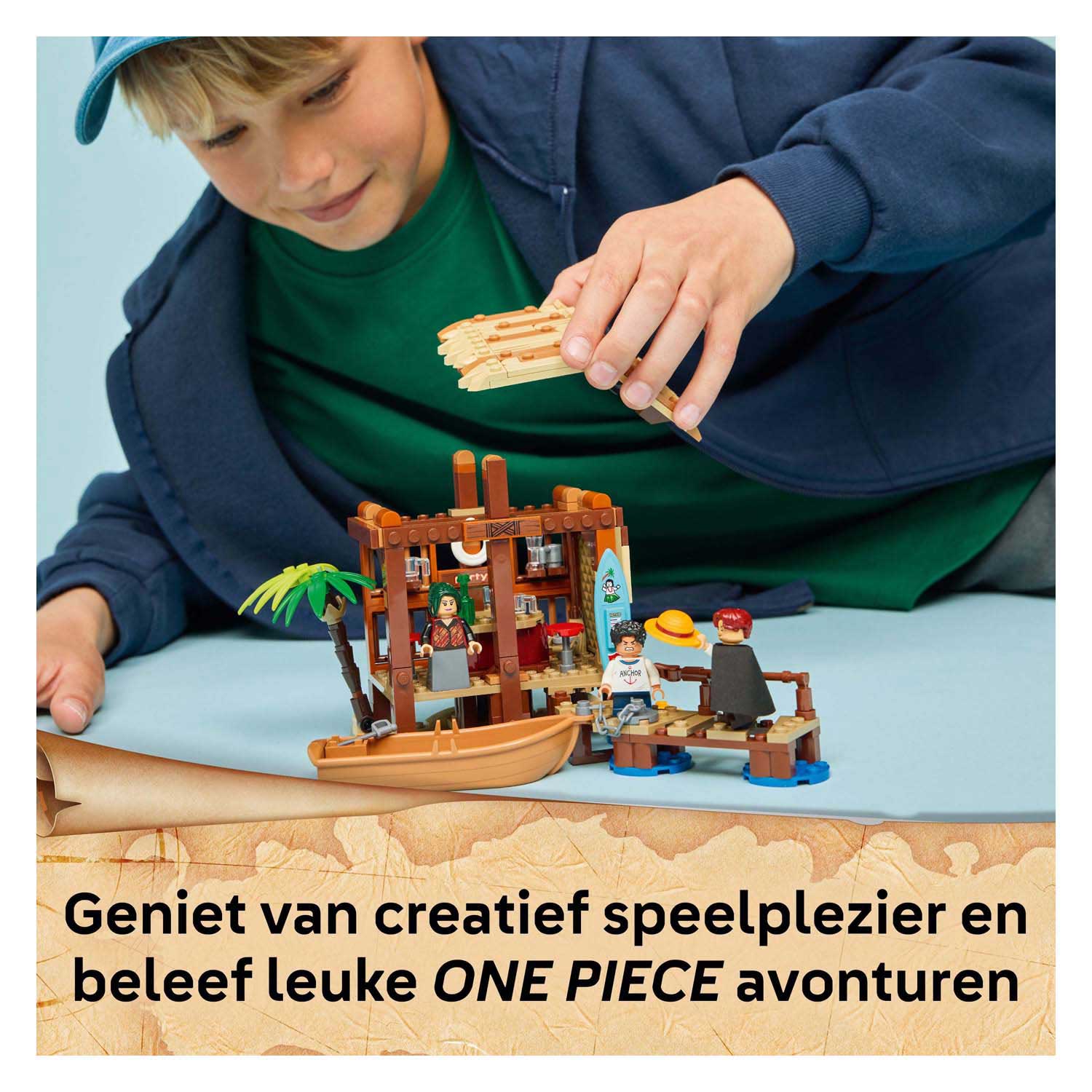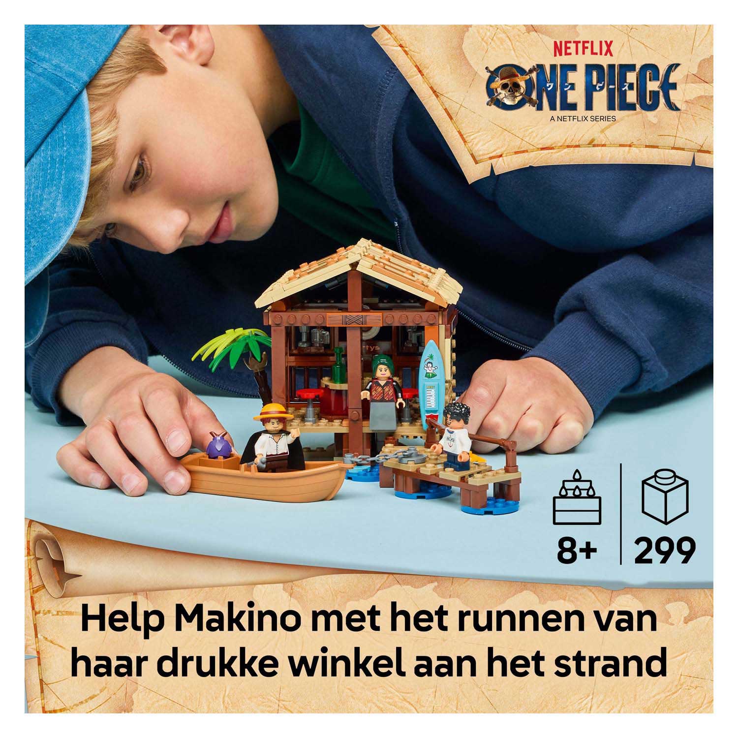 Kinderen kunnen het dak van de strandwinkel verwijderen om toegang te krijgen tot de binnenkant. Hier vinden ze accessoires voor de winkel en leuke klanten. Er is een 'Wanted'-poster om aan de muur te bevestigen en ruimte voor extra 'Wanted'-posters uit andere LEGO® ONE PIECE sets (apart verkrijgbaar). Buiten is een piratenboot met een ketting aan de steiger bevestigd. De set bevat minifiguren van Luffy, Shanks en Makino, 3 bekende personages uit de Netflix serie. Voor extra digitaal plezier kunnen bouwers inzoomen, modellen in 3D draaien en hun voortgang bijhouden met behulp van de intuïtieve LEGO Builder app. De set bevat 299 onderdelen.
