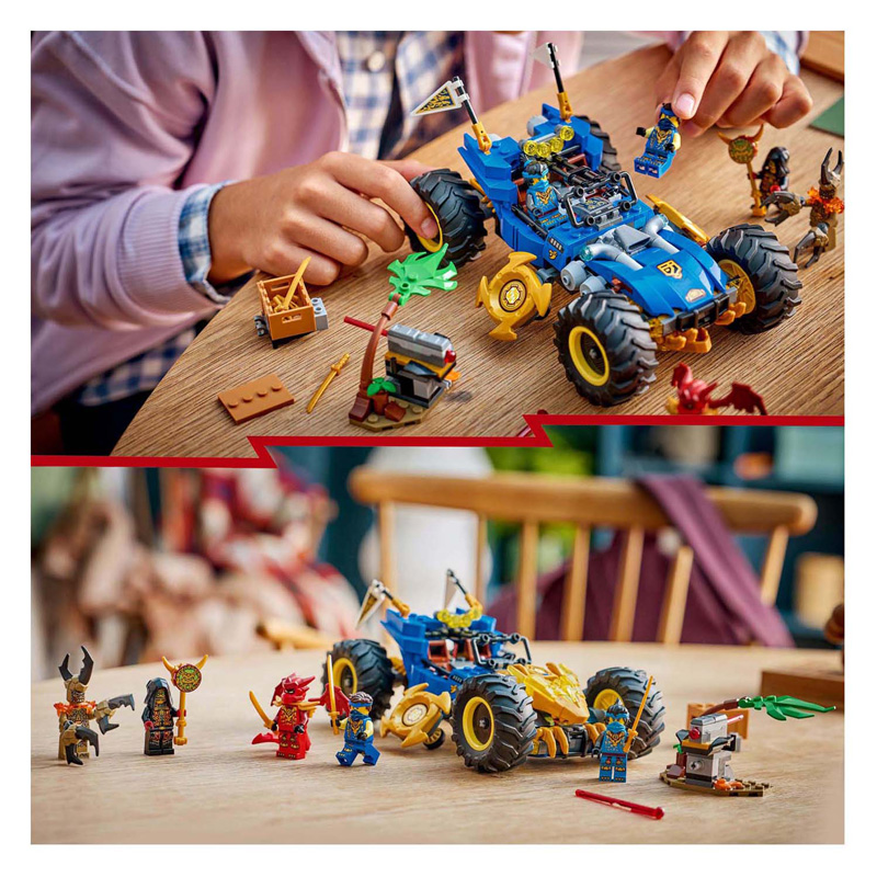Jongens en meisjes vanaf 8 jaar kunnen urenlang genieten van snelle actie met de bouw- en speelset LEGO® NINJAGO® Jay's transformerende auto (71856). Dit 2-in-1 ninjaspeelgoed heeft 2 mogelijkheden: naast de normale versie kun je de voorkant omdraaien voor de drakenmodus met goudkleurige klauwen, een drakenkop en draaiende shurikens.