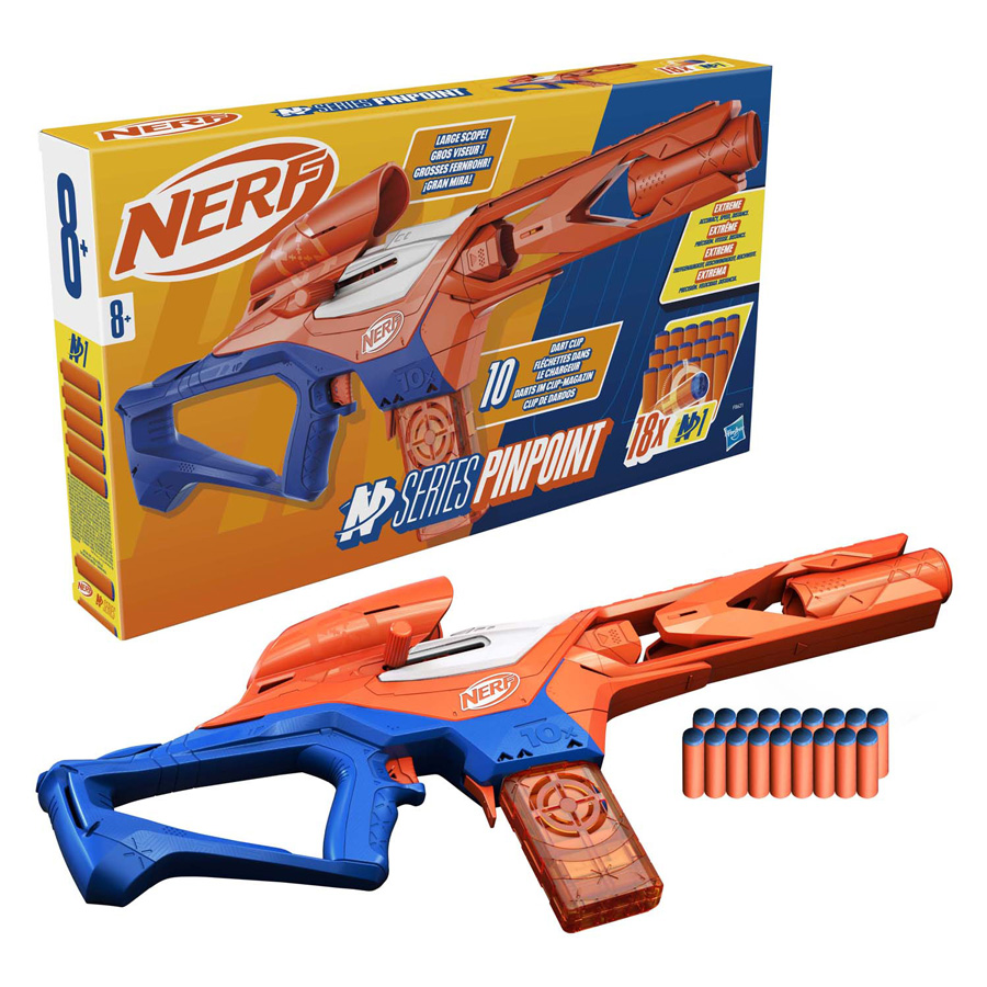 Met hoogwaardige Nerf-dartblasters uit de N-serie en Nerf N1-darts til je jouw gevecht naar een hoger niveau! Je bent al vaardig als Nerf-strijder, maar je hebt nu ook de blaster en darts om de bovenhand te nemen tijdens gevechten binnen en buiten. Het Nerf-merk, de maker van foamdarts, brengt met N1-darts van de Nerf N-serie een nieuwe topper op de markt, voor EXTREME PRECISIE, SNELHEID en AFSTAND! De Pinpoint-dartblaster uit de Nerf N-serie is ontworpen met het oog op precisie, met een hip ontwerp en functies die je de bovenhand bieden bij Nerf-gevechten in de buitenlucht. De blaster met grendelmechanisme heeft een magazijn voor 10 darts en bevat 18 Nerf N1-foamdarts. Je hebt dus genoeg darts om het magazijn vol te laden en extra darts om bij te laden. Laad om te spelen darts in het magazijn, laad het magazijn in de blaster, beweeg de grendel naar achteren en naar voren om door te laden, en haal de trekker over om een dart af te vuren. Nerf N1-darts zijn alleen te gebruiken met blasters uit de Nerf N-serie. Een bril wordt aangeraden (niet inbegrepen). NERF en HASBRO en alle gerelateerde handelsmerken en logo's zijn handelsmerken van Hasbro, Inc.