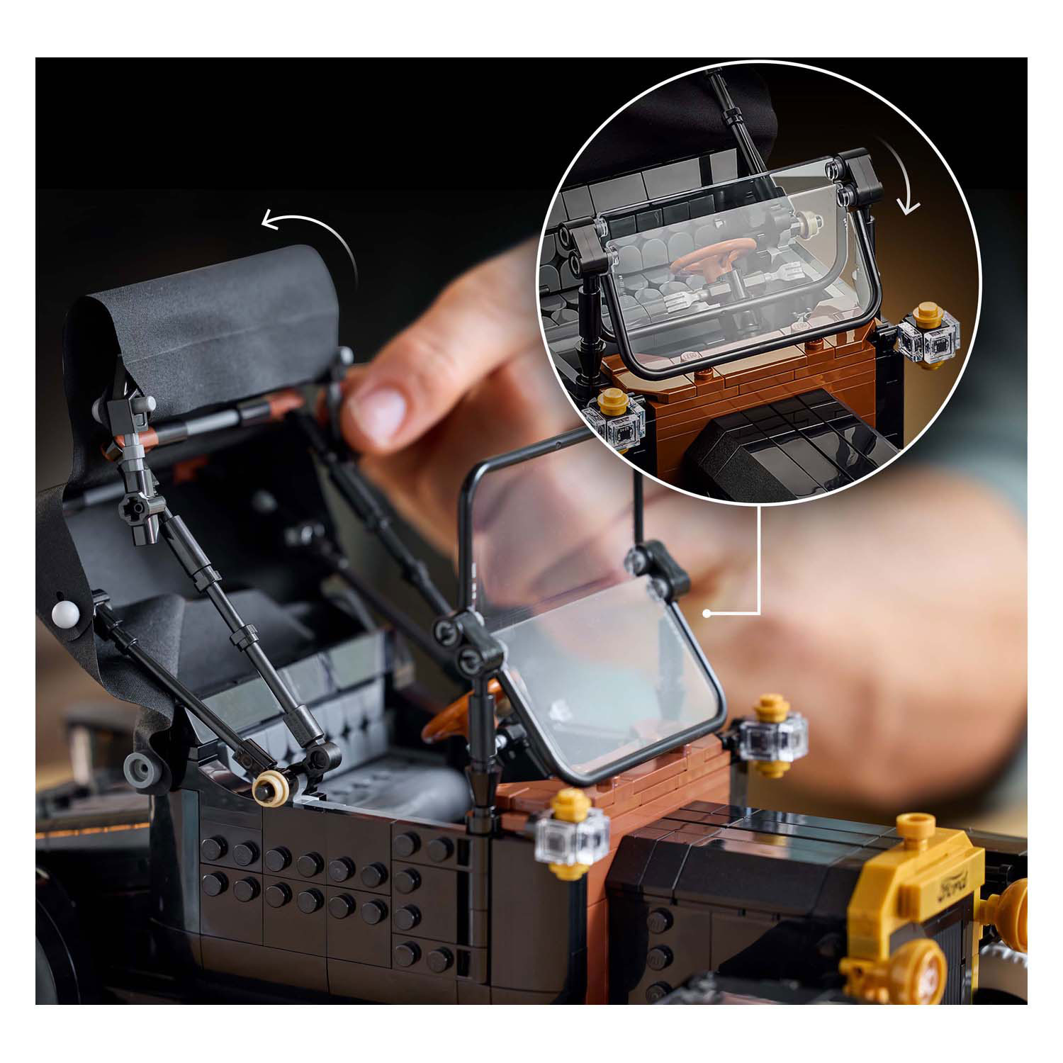 VINTAGE AUTOMODEL – bouw de iconische auto uit de jaren 1910 na met een glanzend zwarte carrosserie, gouden accenten, een opvouwbaar stoffen dak en hoge spaakvelgen met smalle witte rubberen banden