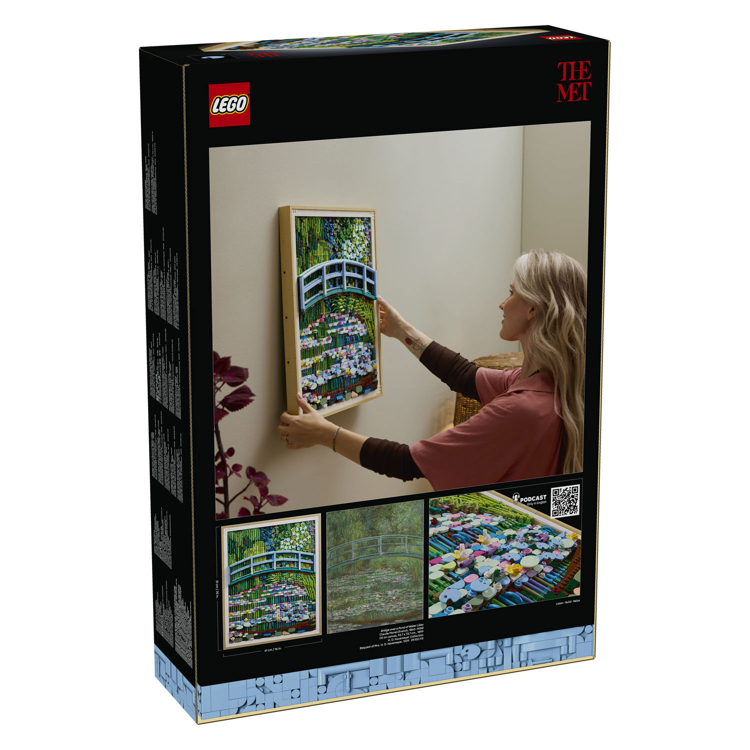 Deze LEGO versie is ontworpen in samenwerking met het Metropolitan Museum of Art in New York waar meer dan 1,5 miljoen kunstwerken te zien zijn, waaronder het beroemde originele olieverfschilderij van Monet uit 1899. Het is een eerbetoon aan de rijke texturen en schoonheid van zijn impressionistische stijl. Deze gedurfde herinterpretatie van zijn meesterwerk maakt op creatieve wijze gebruik van LEGO elementen om de bomen, brug en waterlelies weer te geven die Monet schilderde in zijn tuin in Giverny, waar hij met veel liefde voor zorgde.