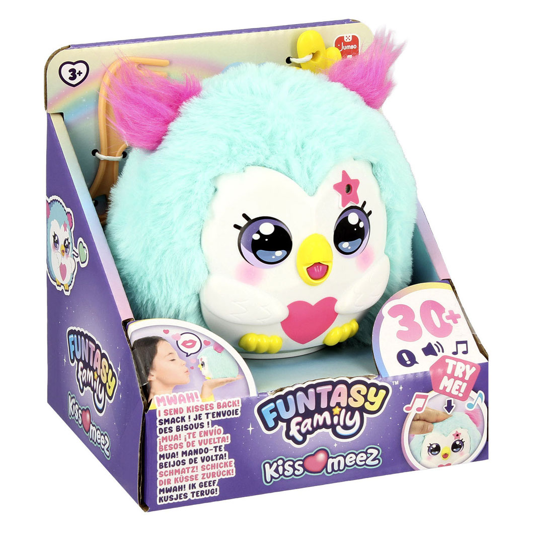 Ontdek de Kiss - Meez Uil, een lieve interactieve plush knuffel die graag knuffelt en kusjes uitdeelt. Aai haar, geef haar een kusje en luister hoe ze vrolijk reageert met zachte geluiden en gegiechel.Kam haar pluizige veren en geef haar iets lekkers om haar blij te maken. Met haar schattige reacties en zachte materialen is deze interactieve uil perfect voor kinderen die houden van knuffels met een eigen persoonlijkheid. Funtasy Family Funtasy Family is een speels merk vol interactieve knuffels die kinderen laten lachen, verrassen en verzorgen. Elk lid van de Funtasy Family heeft een eigen persoonlijkheid en reageert op aanraking, geluid en spel. Van zingen en giechelen tot eten geven en knuffelen: deze interactieve plush speelgoed zorgt keer op keer voor een magisch speelmoment.De producten van Funtasy Family stimuleren fantasierijk en verzorgend spel en dragen bij aan emotionele ontwikkeling. Met verrassende functies, zachte materialen en vrolijke geluiden zijn ze perfecte maatjes voor kinderen.