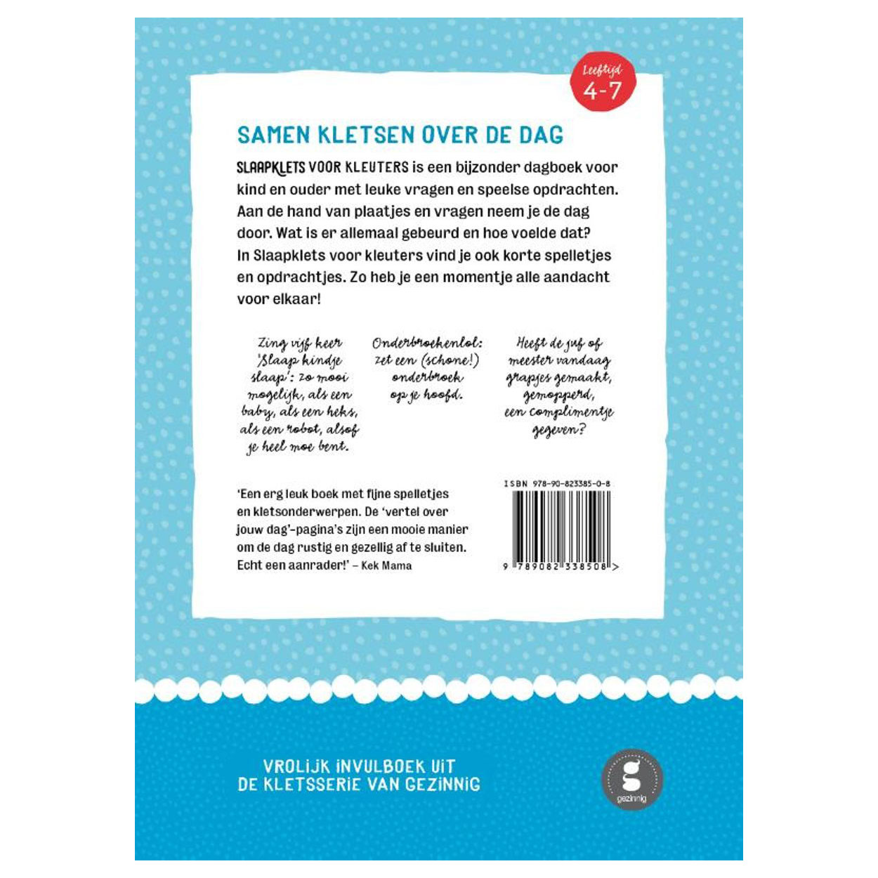 Slaapklets! voor kleuters is een dagboek voor het slapengaan. Met behulp van plaatjes en vragen kun je de dag doornemen met je kind. Wat is er allemaal gebeurd en hoe voelde dat?