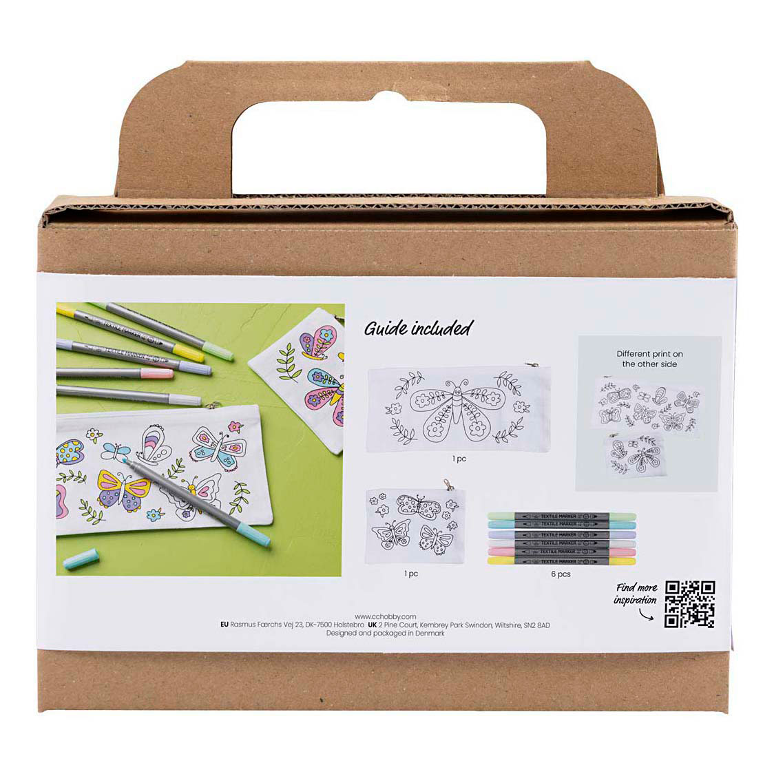 Deze set bevat een etui en een portemonnee van textiel met ritssluiting en voorbedrukte vlindermotieven. Inclusief textielstiften en instructies om zelf in te kleuren.
