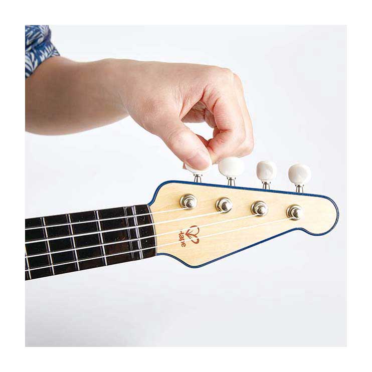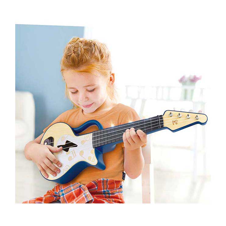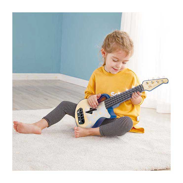 Interactieve ukulele van hout en kunststof met lichtjes die kinderen begeleiden bij het spelen. Met leer- en bandmodus, oplaadbare batterij en USB-kabel. Afmetingen ca. 54 x 17 x 6 cm. Geschikt vanaf 3 jaar.