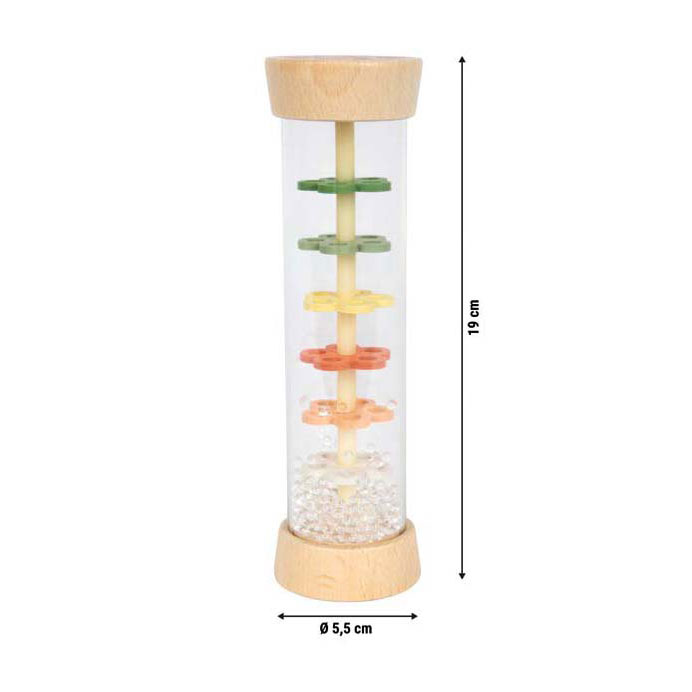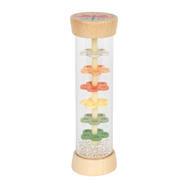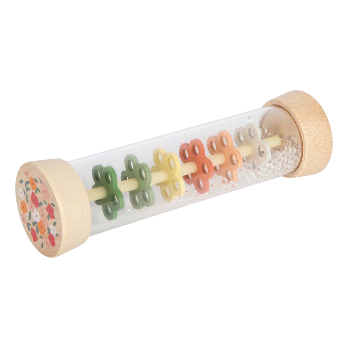 De Little Friends-regenmaker brengt de magie van regendruppels rechtstreeks naar de kinderkamer - zowel visueel als akoestisch! De kleine kraaltjes in de regenstok creëren een aangenaam, zacht getik dat doet denken aan vallende regen, terwijl ze door zes kleurrijke geperforeerde plaatjes in de vorm van bloemen glijden. Tegelijkertijd is de regenmaker een echte allrounder: als geluidsspeeltje, rammelaar, ritme-instrument of rustgevend zintuiglijk speelgoed begeleidt hij baby's en peuters bij allerlei speelmomenten. Dankzij de transparante buis zijn kinderen gefascineerd door het spel van de glinsterende kraaltjes - dit traint specifiek hun visuele waarneming. Het gelijkmatige druppelen van de kraaltjes heeft een kalmerend effect, bevordert het luisterbegrip en nodigt kinderen uit om te ontspannen, te luisteren en te imiteren. Ook geschikt om mee te rollen en te rammelen voor de allerkleinsten!