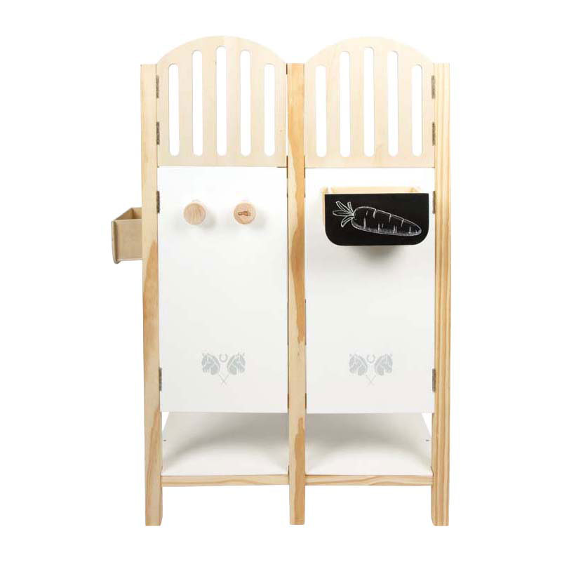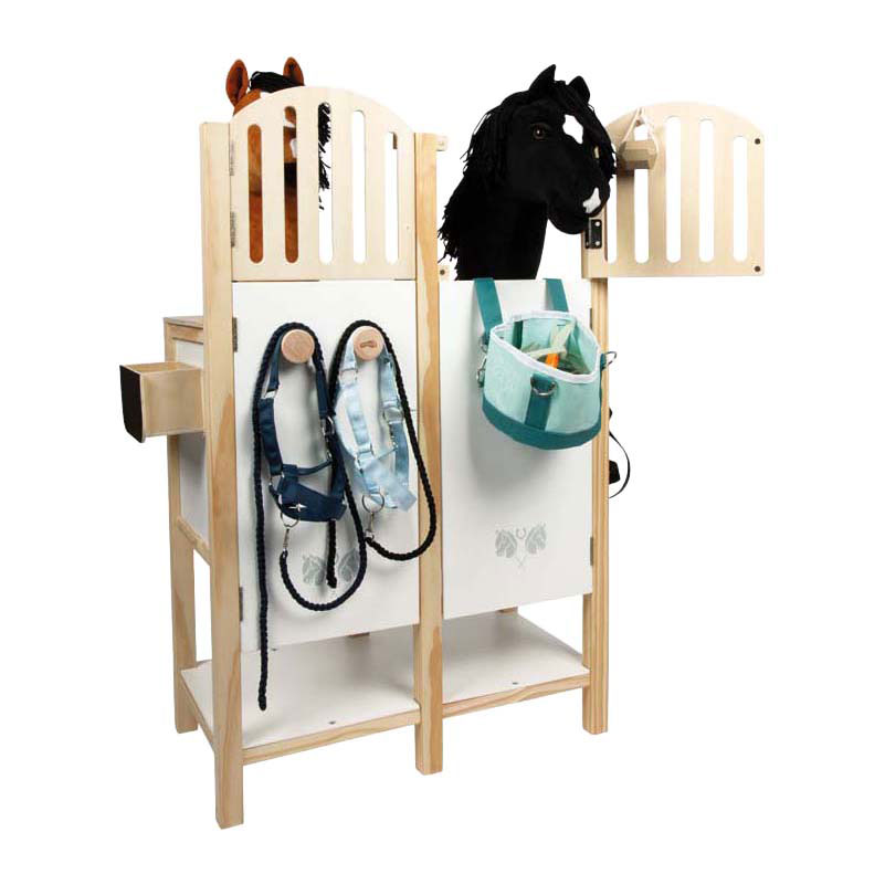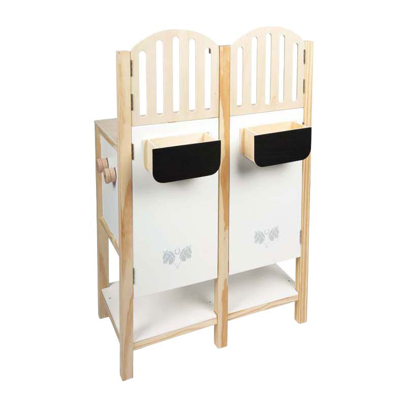 Twee stalboxen voor kleine paardenliefhebbers! De gedetailleerde Hobby Horse-stal van stevig hout biedt plaats aan twee Hobby Horses en maakt dankzij de zorgvuldig ontworpen details en uitrusting grote indruk. De afneembare voerbakken zijn voorzien van een krijtbord en kunnen individueel worden beschreven.