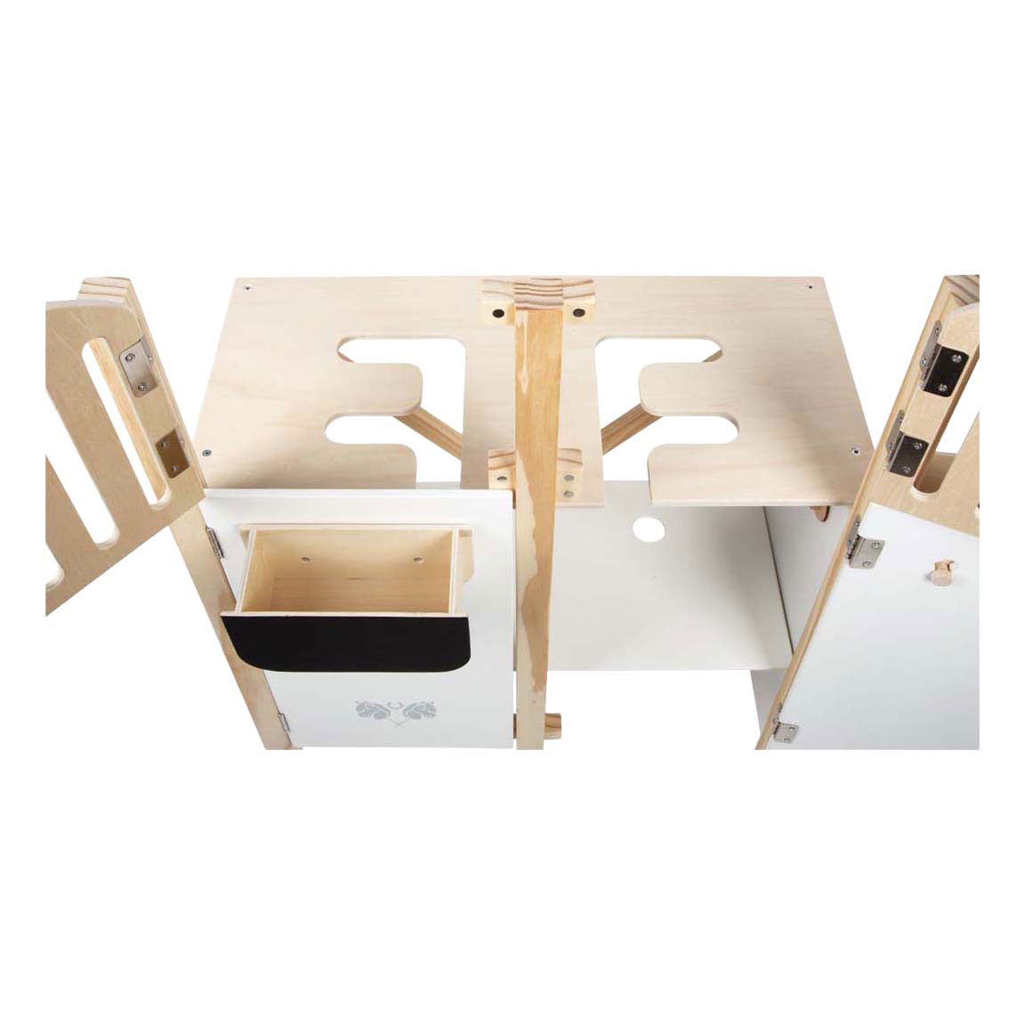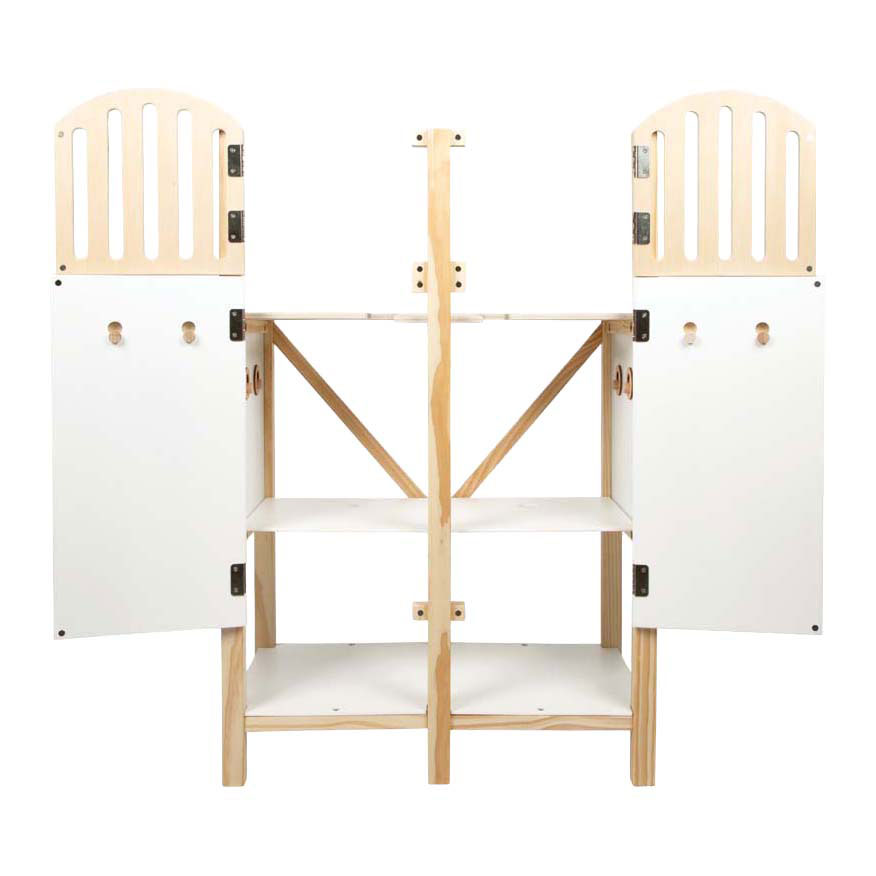 Dankzij magnetische sluitingen kunnen de boxdeuren en ramen afzonderlijk worden geopend, wat het spelen nog realistischer maakt. Bij een open raam kijkt het hobbypaard naar buiten, bij een gesloten raam staat het rustig in de box! De onderste plank biedt handige opbergruimte voor verzorgingsaccessoires, halster, schoonmaakspullen of snoepjes: zo blijft alles binnen handbereik en netjes opgeborgen.