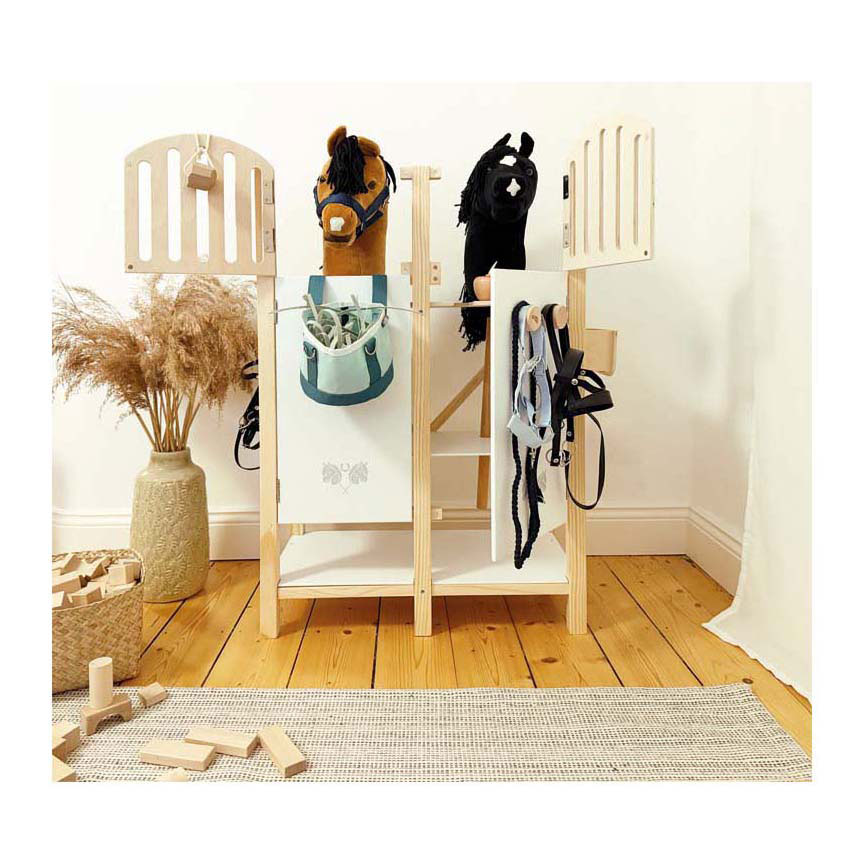 Met de hobbypaardenstal verandert de kinderkamer in een eigen manege! De robuuste houten constructie biedt niet alleen een veilige plek voor twee Hobby Horses, maar vormt ook een veelzijdige achtergrond voor creatieve rollenspellen rond het thema paardrijden, verzorgen en voeden.