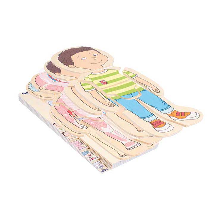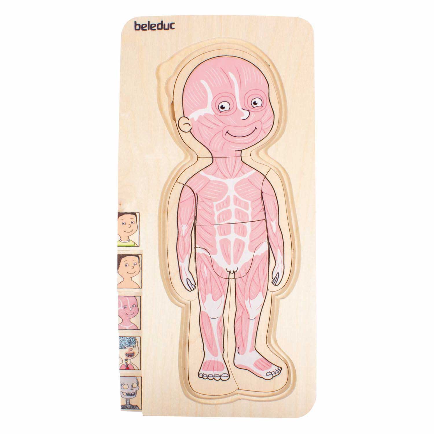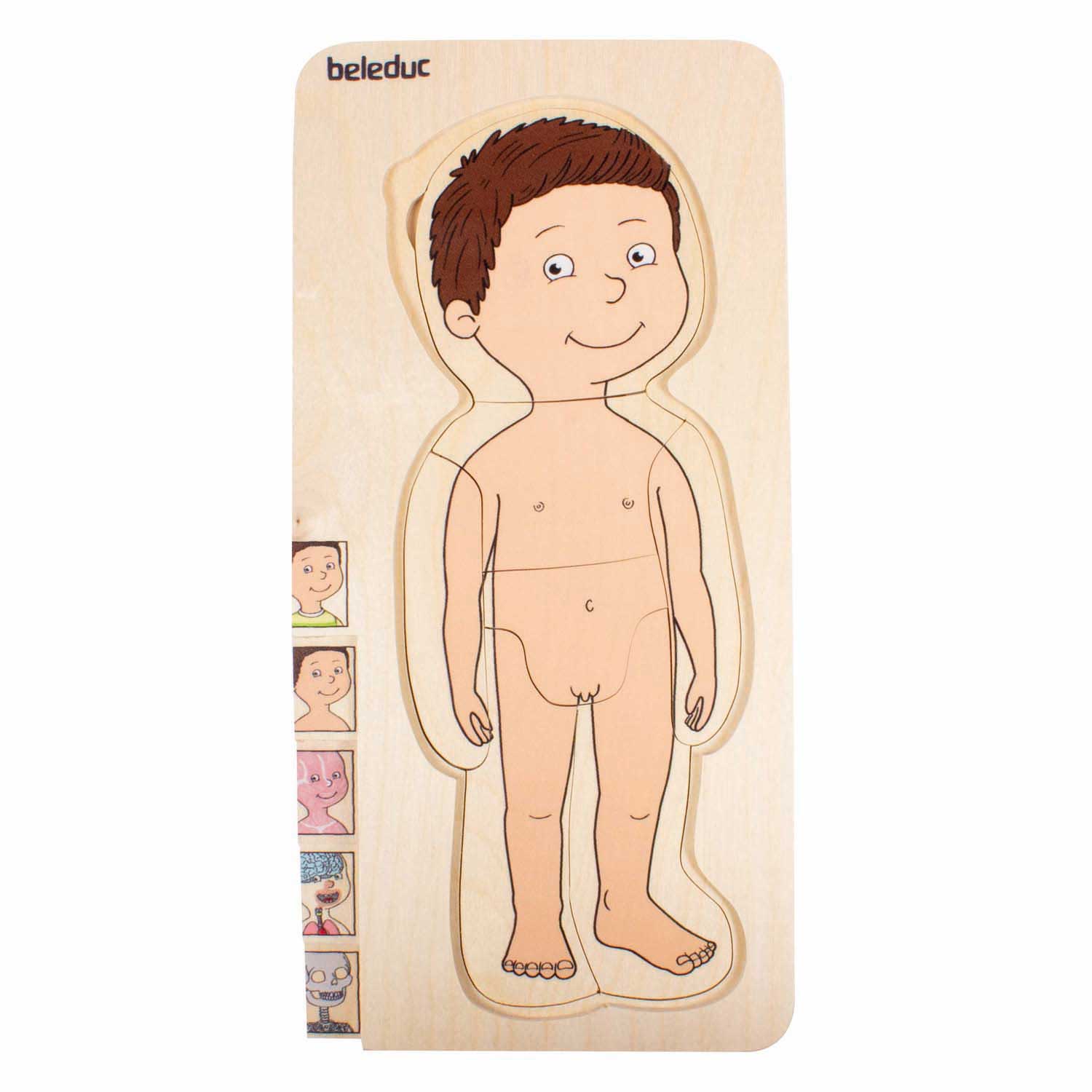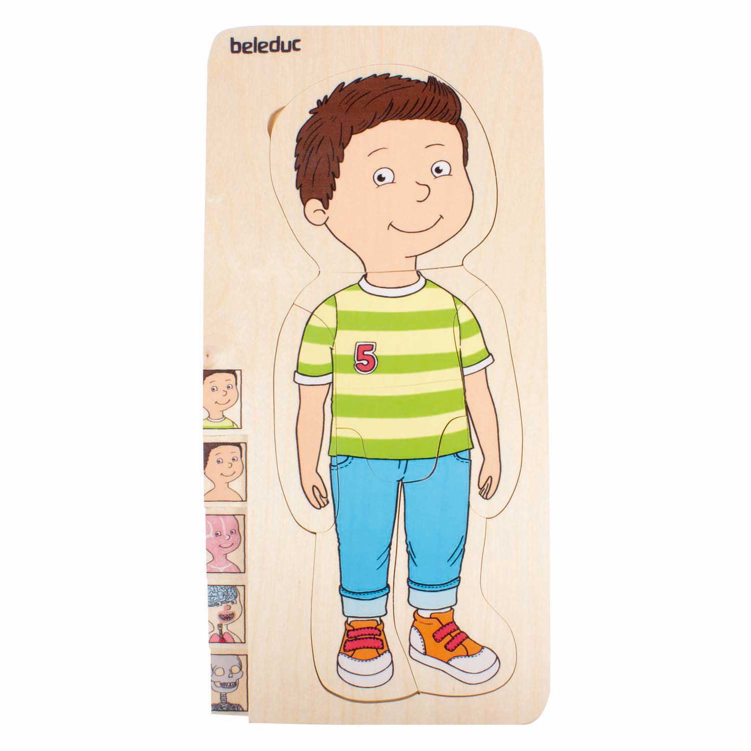 Houten laagjespuzzel van een jongenslichaam met 5 lagen: kleding, huid, spieren, organen en skelet. Educatief en stevig. Vanaf 4 jaar.