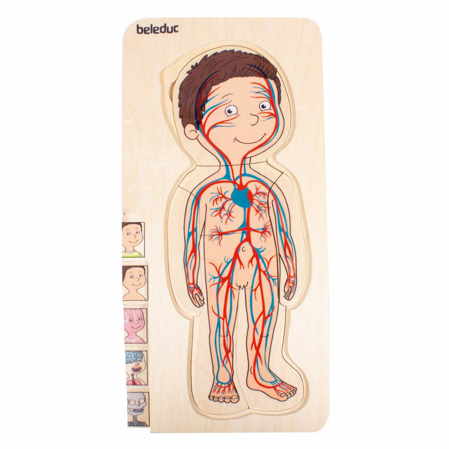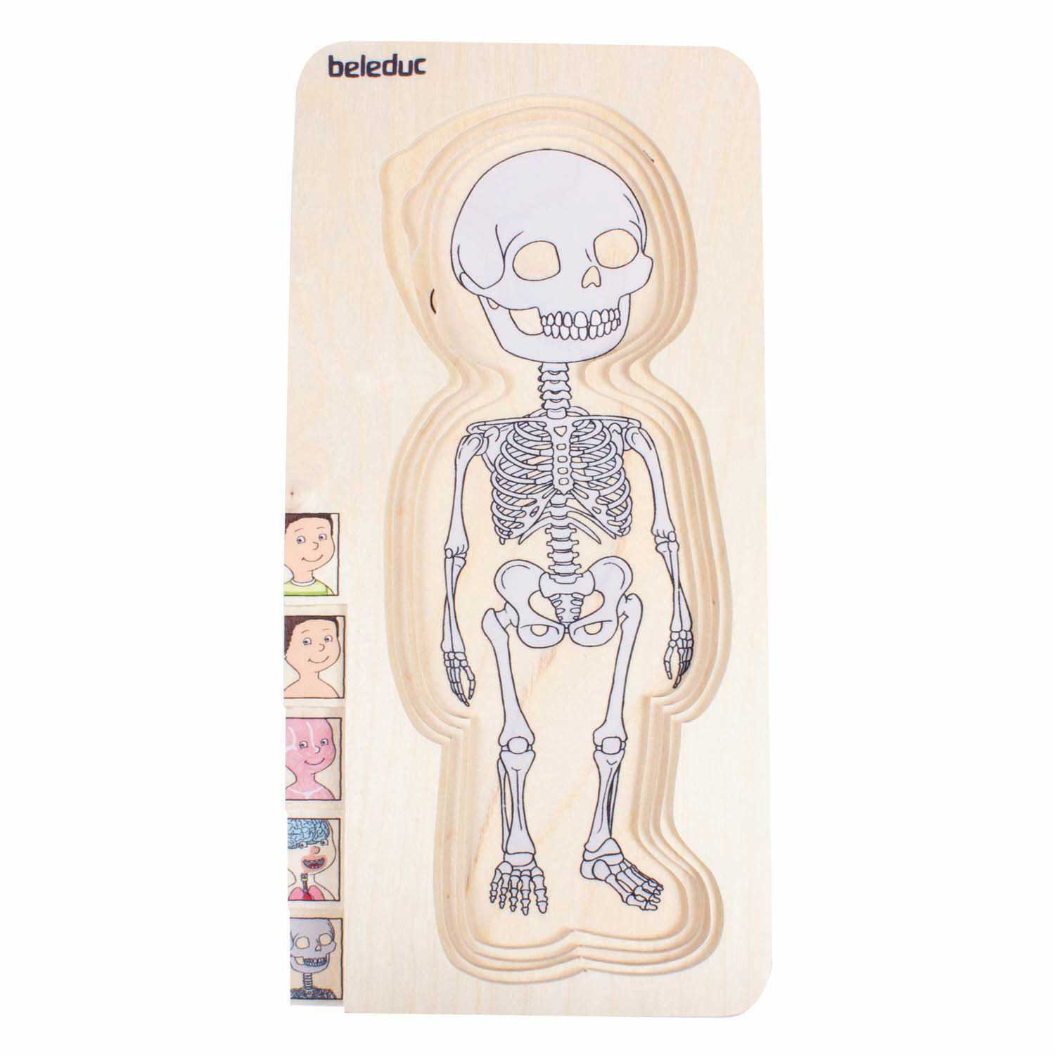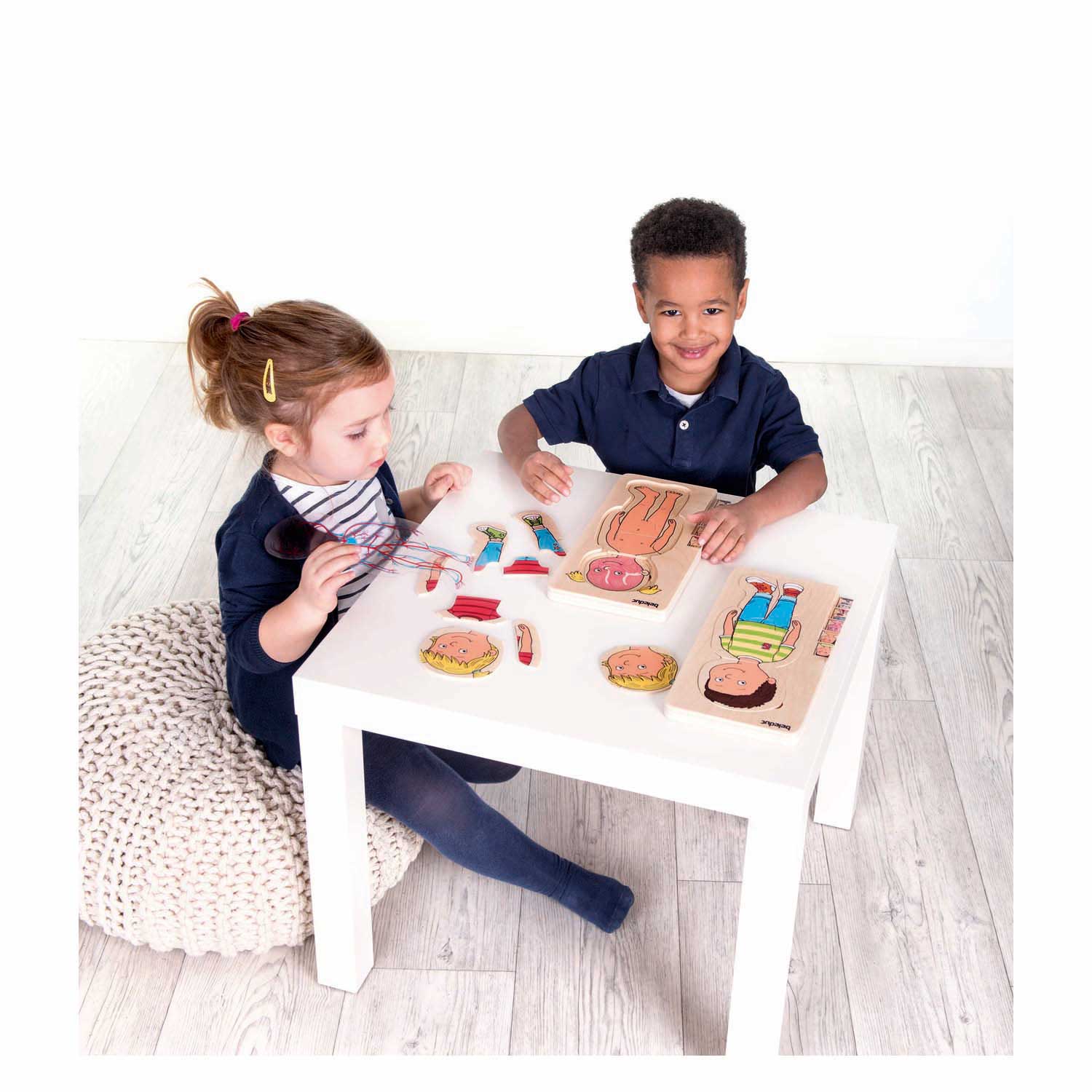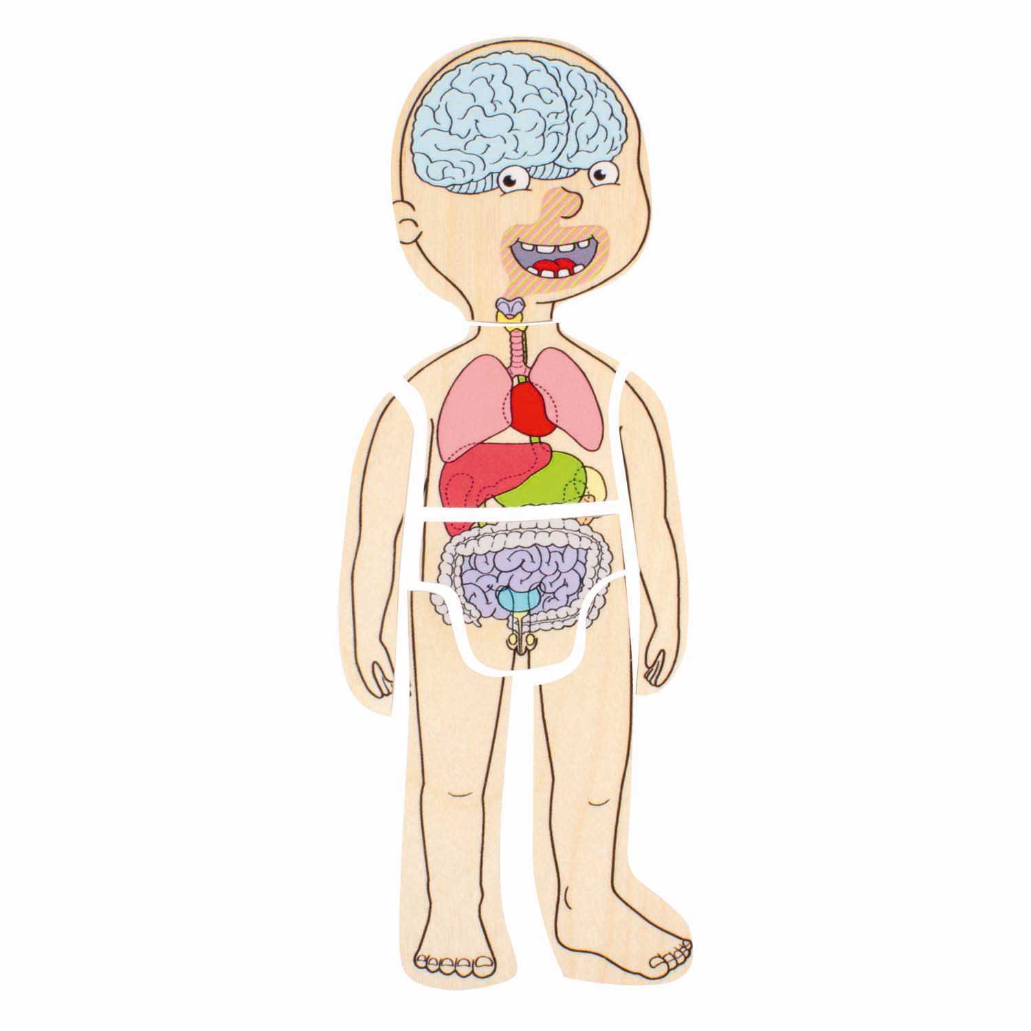 Houten laagjespuzzel van een jongenslichaam met 5 lagen: kleding, huid, spieren, organen en skelet. Educatief en stevig. Vanaf 4 jaar.