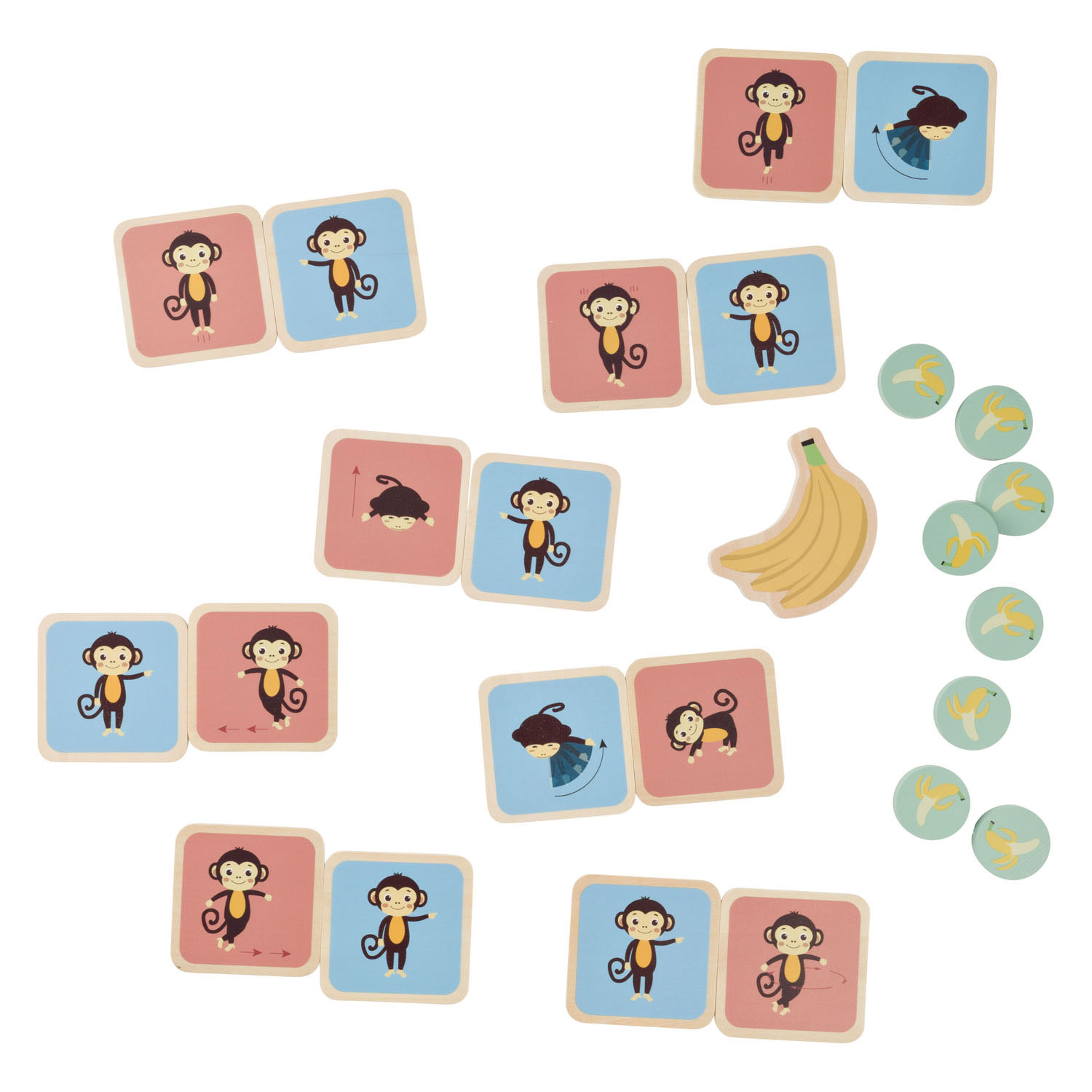 Laat één speler een route maken en laat de andere speler(s) de aanwijzingen van de aapjes volgen. Let goed op waar ze je naartoe sturen en hoe ze willen dat je beweegt — misschien moet je draaien, huppen of zijwaarts lopen! En vergeet niet om onderweg alle bananen te verzamelen!
