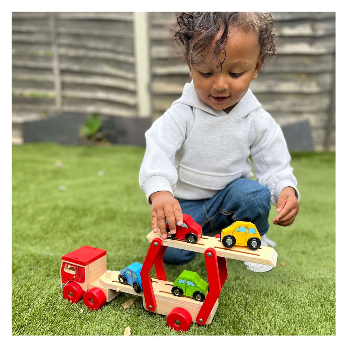 Deze houten speelgoedtransporter helpt kinderen bij het ontwikkelen van hun behendigheid en coördinatie tijdens het spelen. Hij kan vier kleurrijke houten autootjes vervoeren (die mooi op de aanhanger passen) en is veilig voor kleine handjes om mee te spelen.