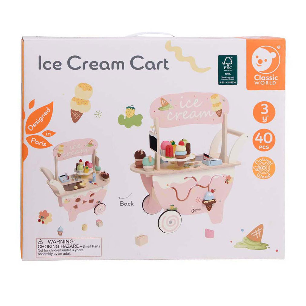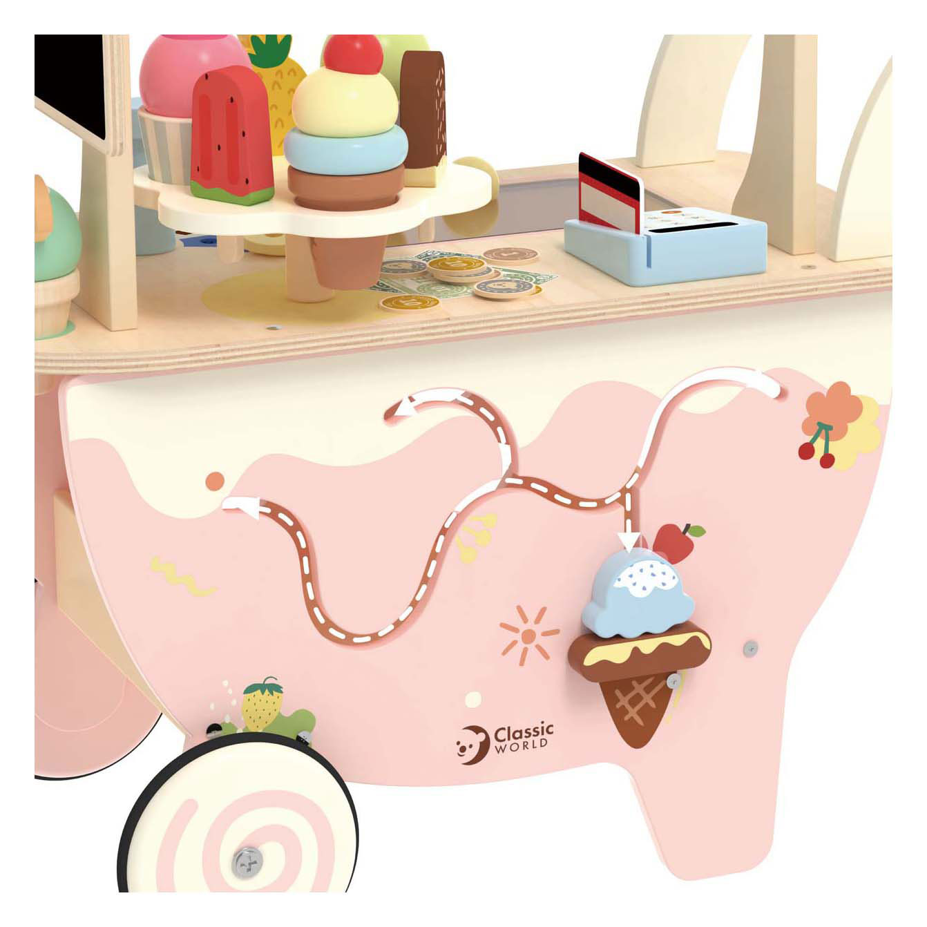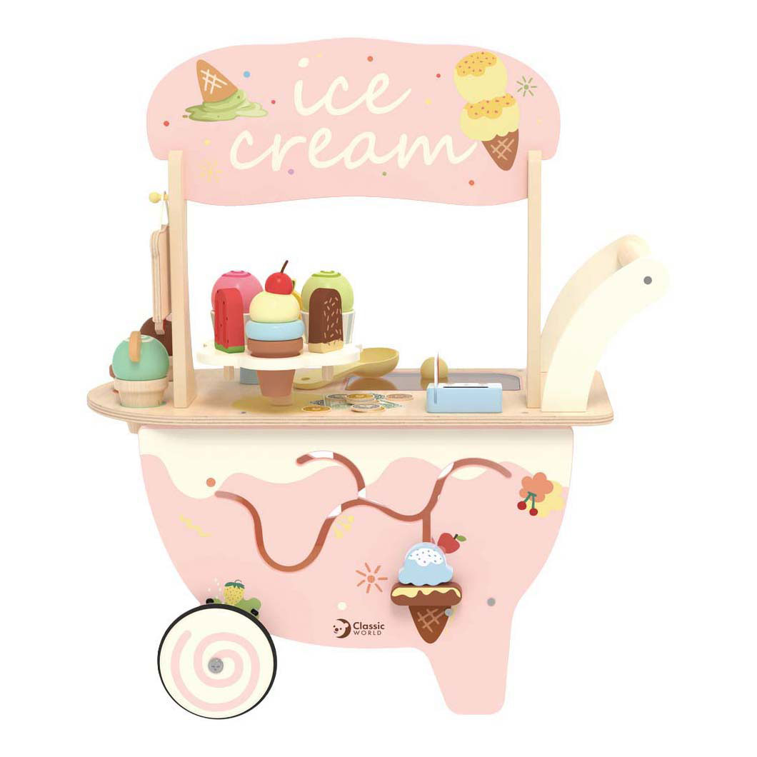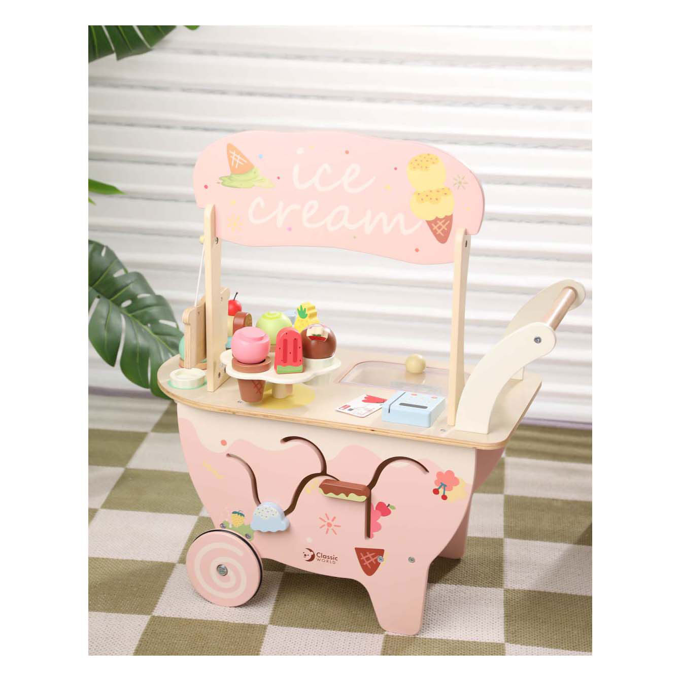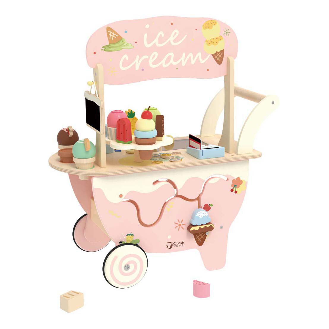 Classic World houten ijskar met verschillende ijsjes en accessoires. Kinderen kunnen rondrijden met de kar en hun eigen ijsjes verkopen tijdens het spelen. De set bestaat uit 40 onderdelen en is gemaakt van hout. Geschikt voor kinderen vanaf 3 jaar oud. Een vrolijke speelset voor rollenspel.
