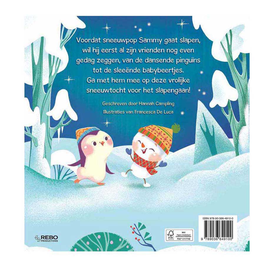 Voordat sneeuwpop Sammy gaat slapen, wil hij eerst al zijn vrienden nog even gedag zeggen, van de dansende pinguïns tot de sleeënde babybeertjes. Ga met hem mee op deze vrolijke sneeuwtocht voor het slapengaan!