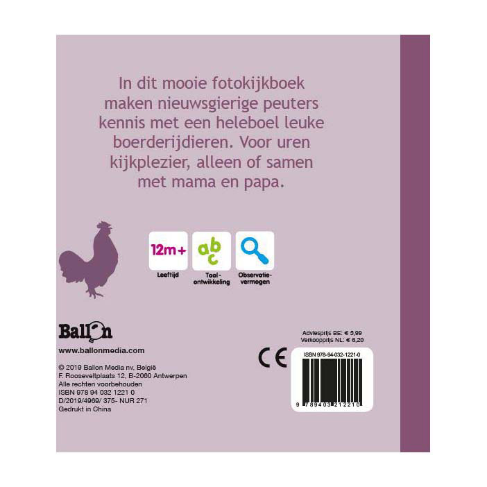 In dit mooie fotokijkboek maken nieuwsgierige peuters kennis met een heleboel leuke boerderijdieren. Voor uren kijkplezier, alleen of samen met mama en papa.